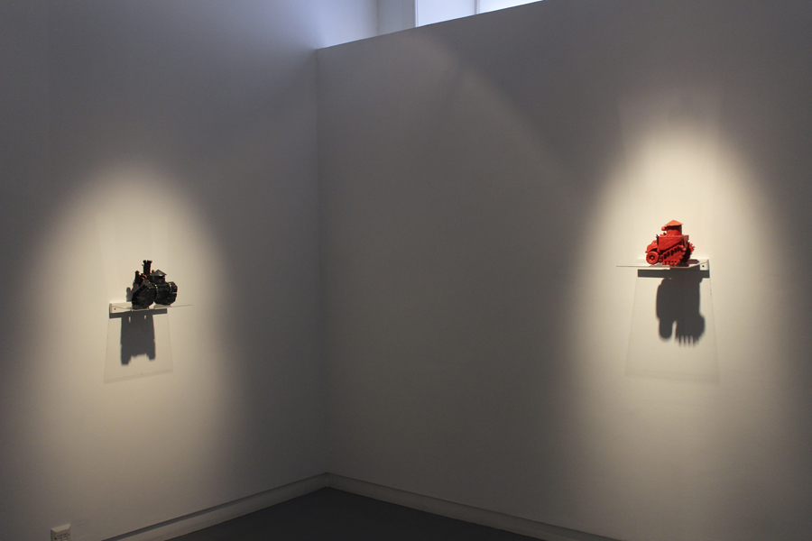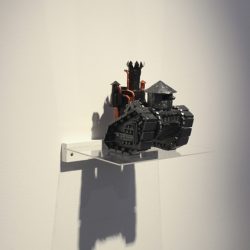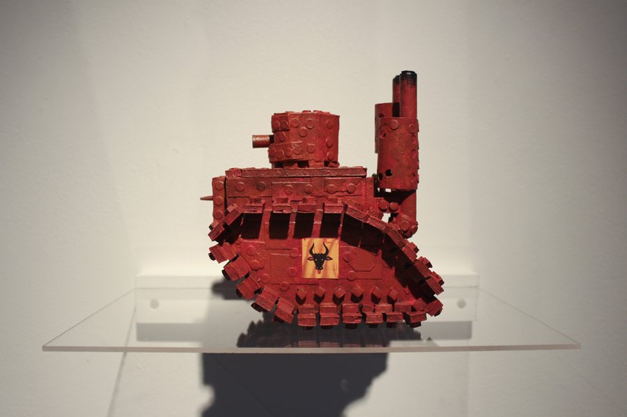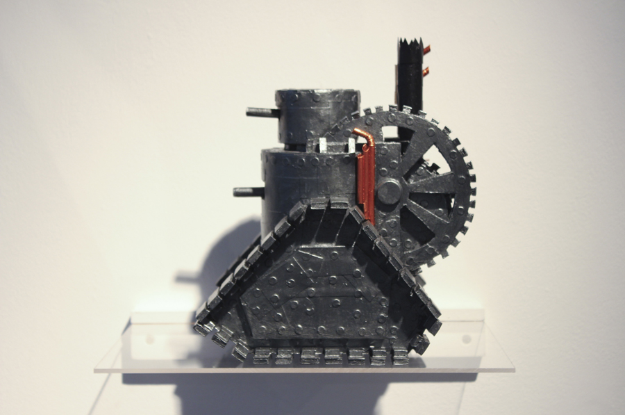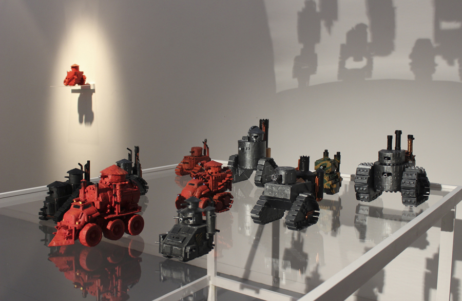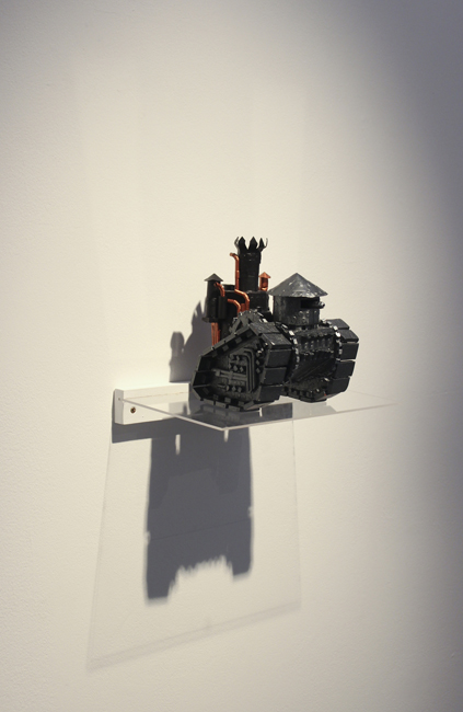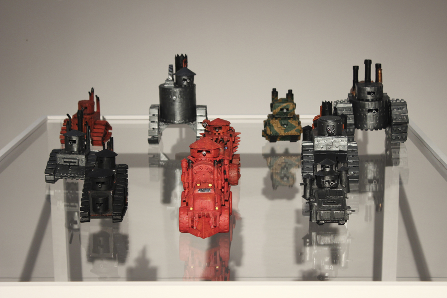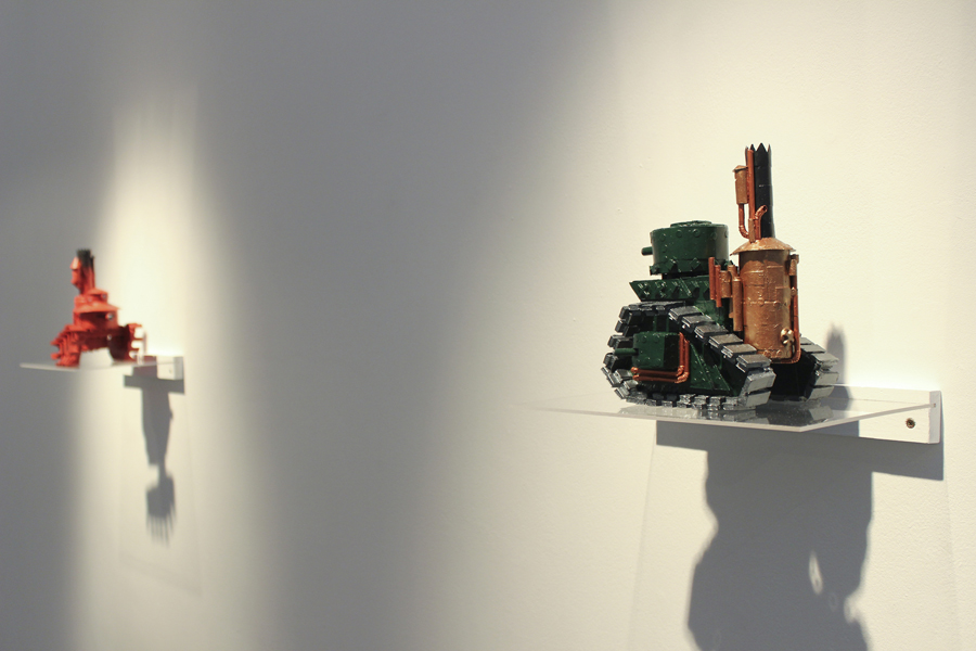 Although they arrive in numbers, they are all one of a kind and each have their own individual characteristics. They are an army, and bring to mind the fantasy world of Warhammer and the artillery that accompanies it. They also speak of the artist’s love of American diesel locomotives, chassis and steam engines. These steam punk tanks are small but mighty. Children and adults of all ages will have their imaginations working overdrive at the possibility of play and power rolled up into each of these sculptural tanks.