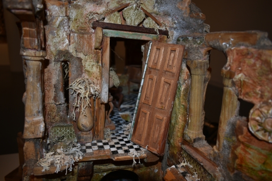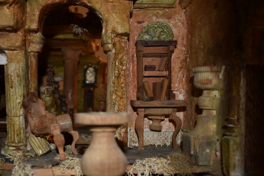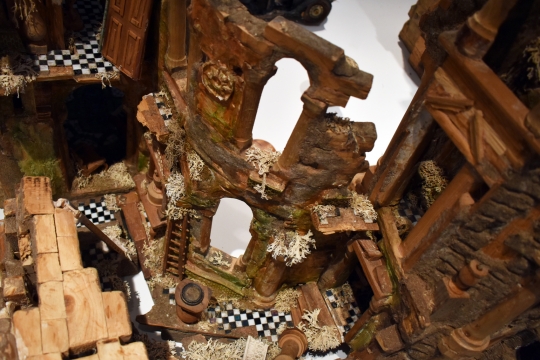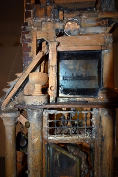 Influenced by Frank Lloyd Wright, M.C.Escher and Psychedelia, Logie combines his love for architecture and construction with a magical element. Also in his work there is often a partially hidden bio-graphical nature. His interest and skill in lathe work originates from his father’s trade as a woodturner. His family home and garden is littered with antiques, miniatures of buildings, industrial working tools and equipment. Logie seems to marvel at found objects. Even if not personally found, gifted or even dug up, he will age items to become warped and distressed.