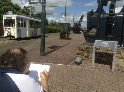 Valerie tells us more about the outing: “The artists travelled from Argyle street lower level station to Coatbridge Central and we walked the fives minutes to the museum. We started with a tour of some of the indoor exhibits before heading out to see the archaeological site. It was a wonderful sunny day so we took advantage of the weather to sketch outside, including the giant locomotive and coal mining and furnace machine parts positioned on site.