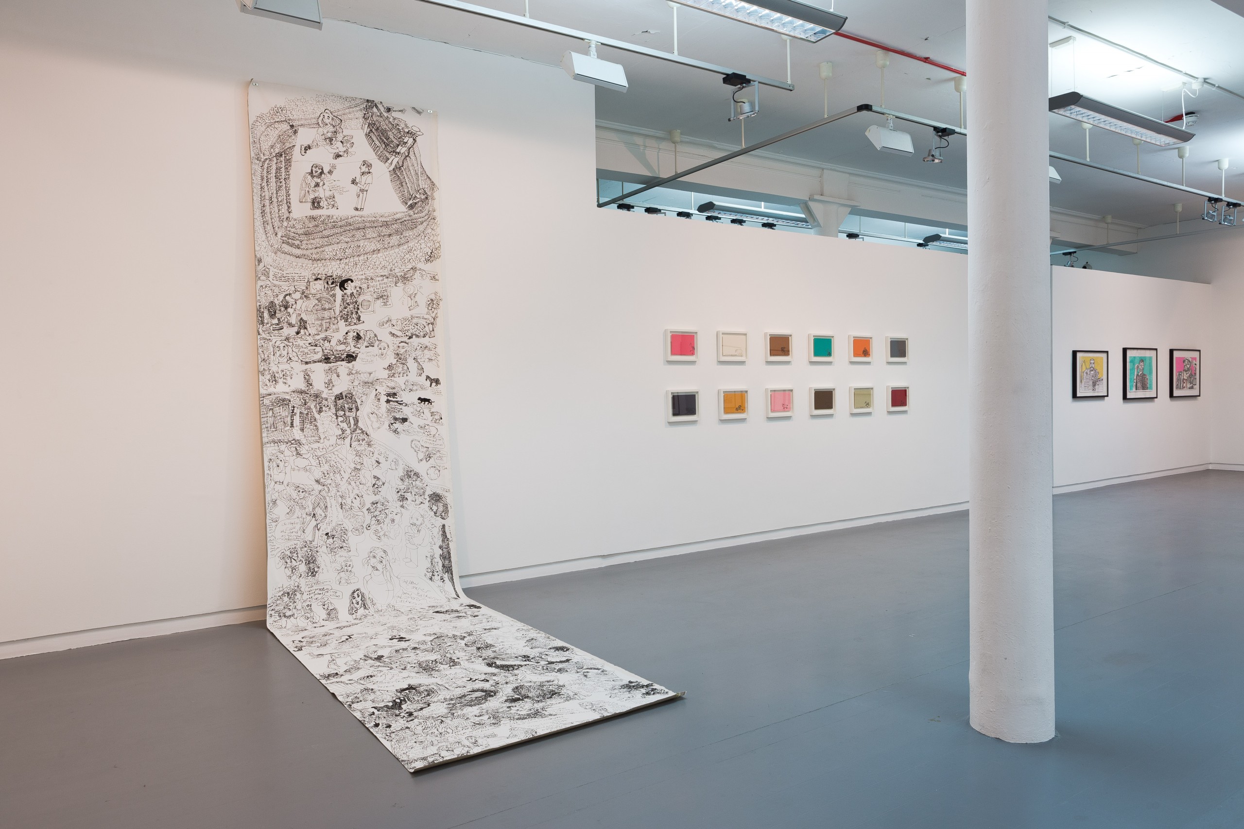 The drawings on the scroll were made by Leslie in front of a live audience at The Manchester Contemporary 2019. Leslie likes to work in front of an audience, and had planned to do this in our gallery during Glasgow International (a plan sadly halted by the pandemic).