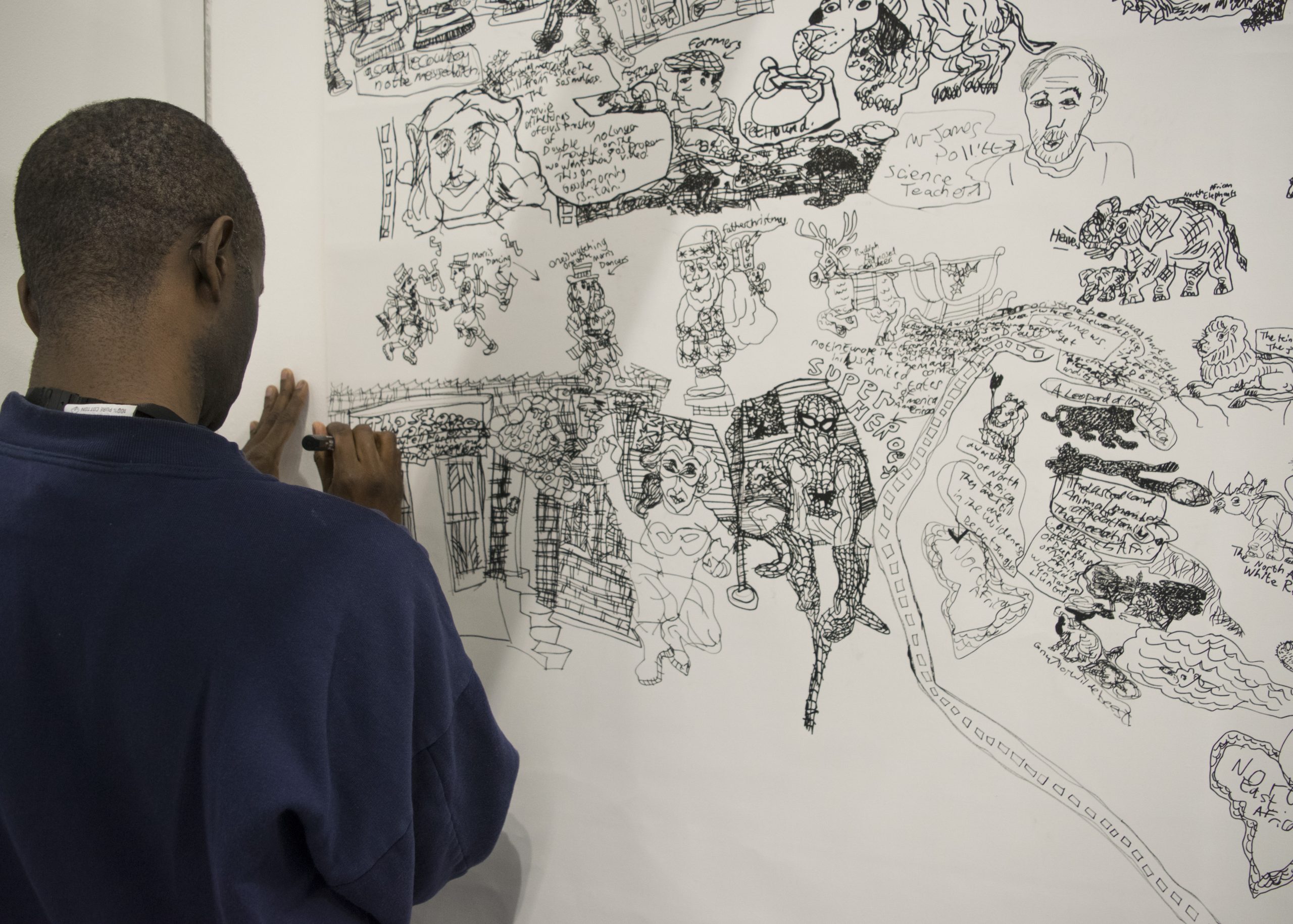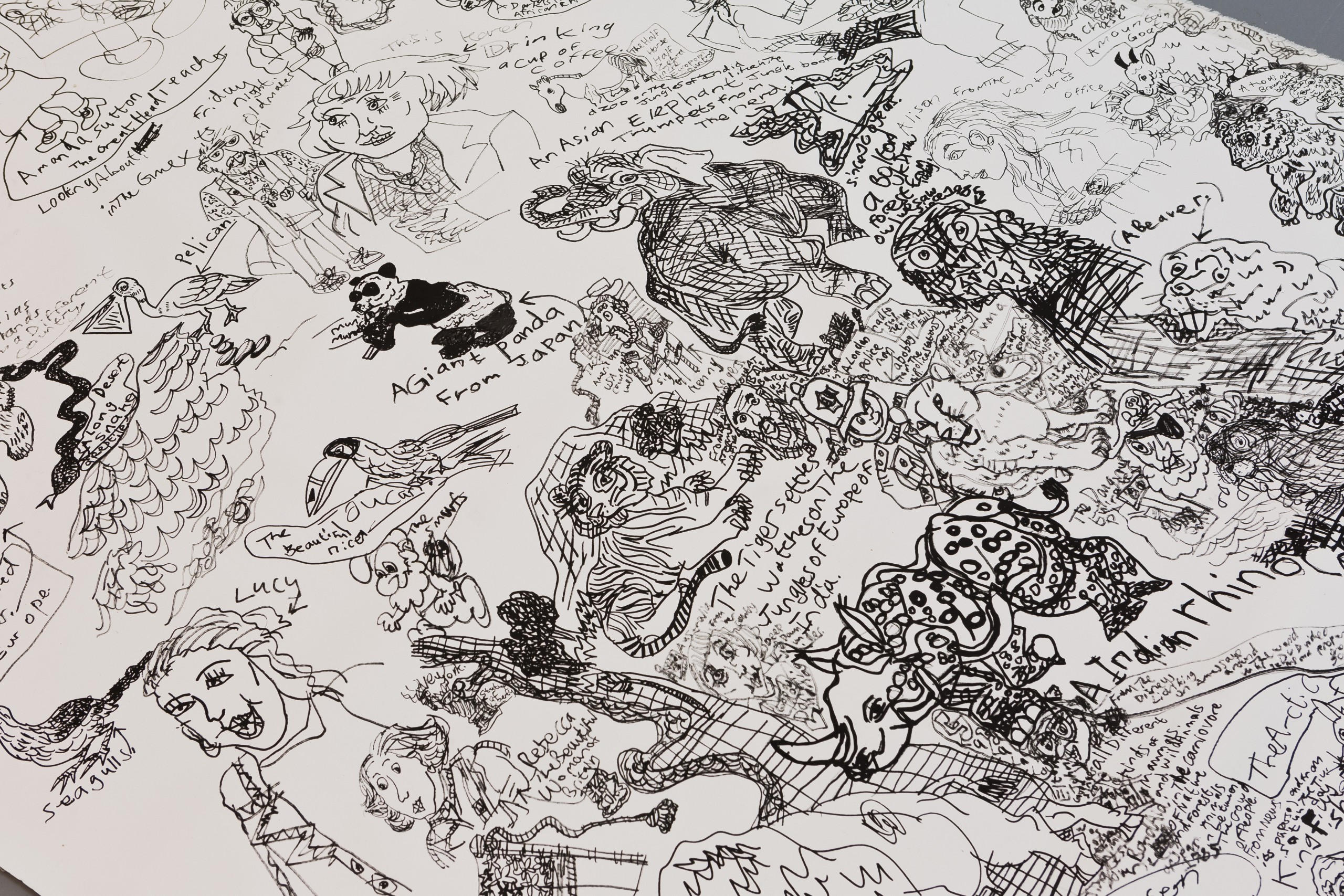 Leslie’s affinity with animals is reflected in the scroll drawings. There’s a toucan, a beaver, a giant panda and an Indian rhino (to name a few).