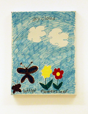 Sandra makes texts and images and in her pictures she often fills the blanks with words that she has invented to sound like the object she is trying to portray. Her work recalls everyday life, yet always remains whimsically illustrative; creating a narrative account of her life through a unique visual onomatopoeia.