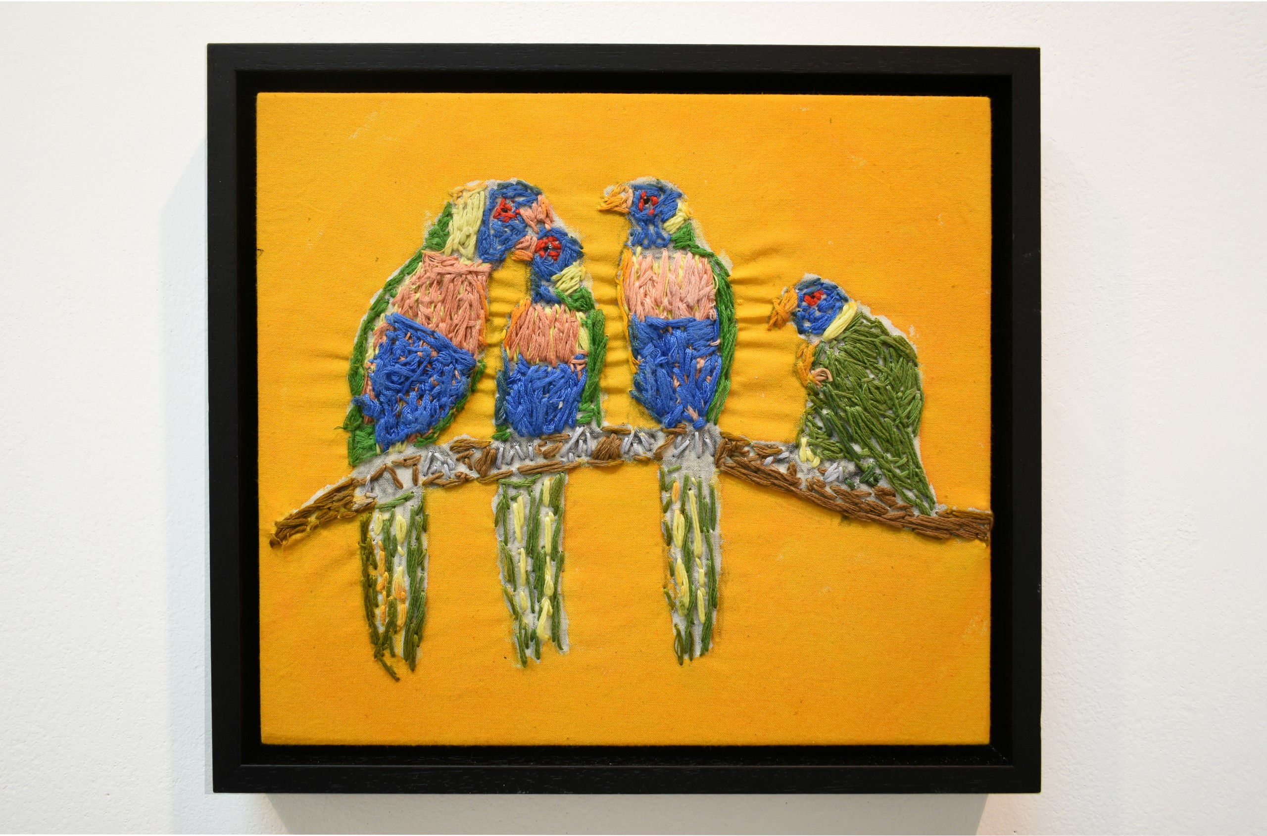 Doreen Kay’s ‘Lorikeets’ embroidery measures 25 x 28 cm and is embroidered onto orange cloth. It sits within a black wood frame with no glass.
