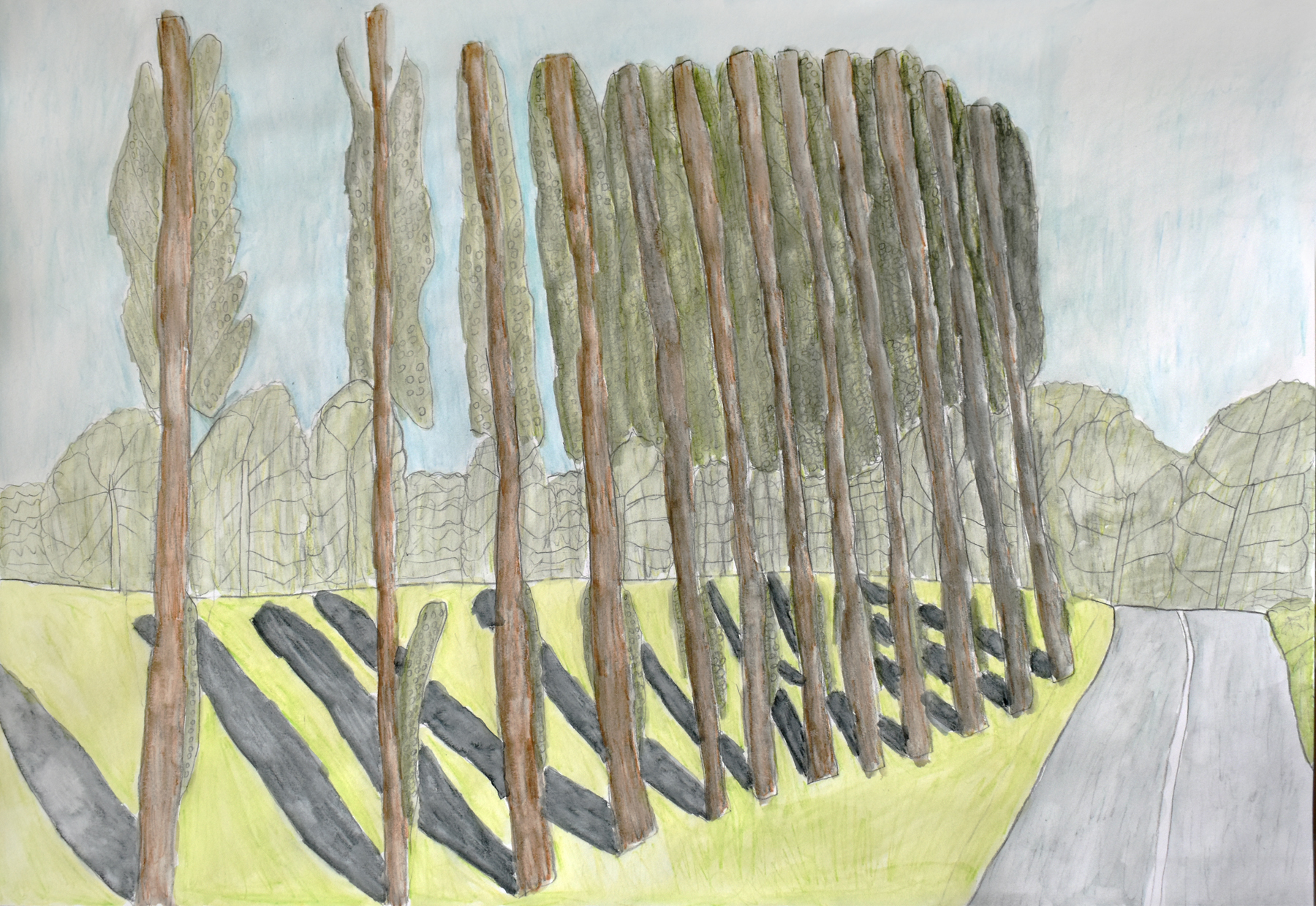 ‘Rouken Glen’ is a park in Glasgow and we can see it was a very sunny day when Michael took the photograph he used to make this picture. The row of trees stand tall and straight with their shadows lined up as symmetrically as the tree themselves.