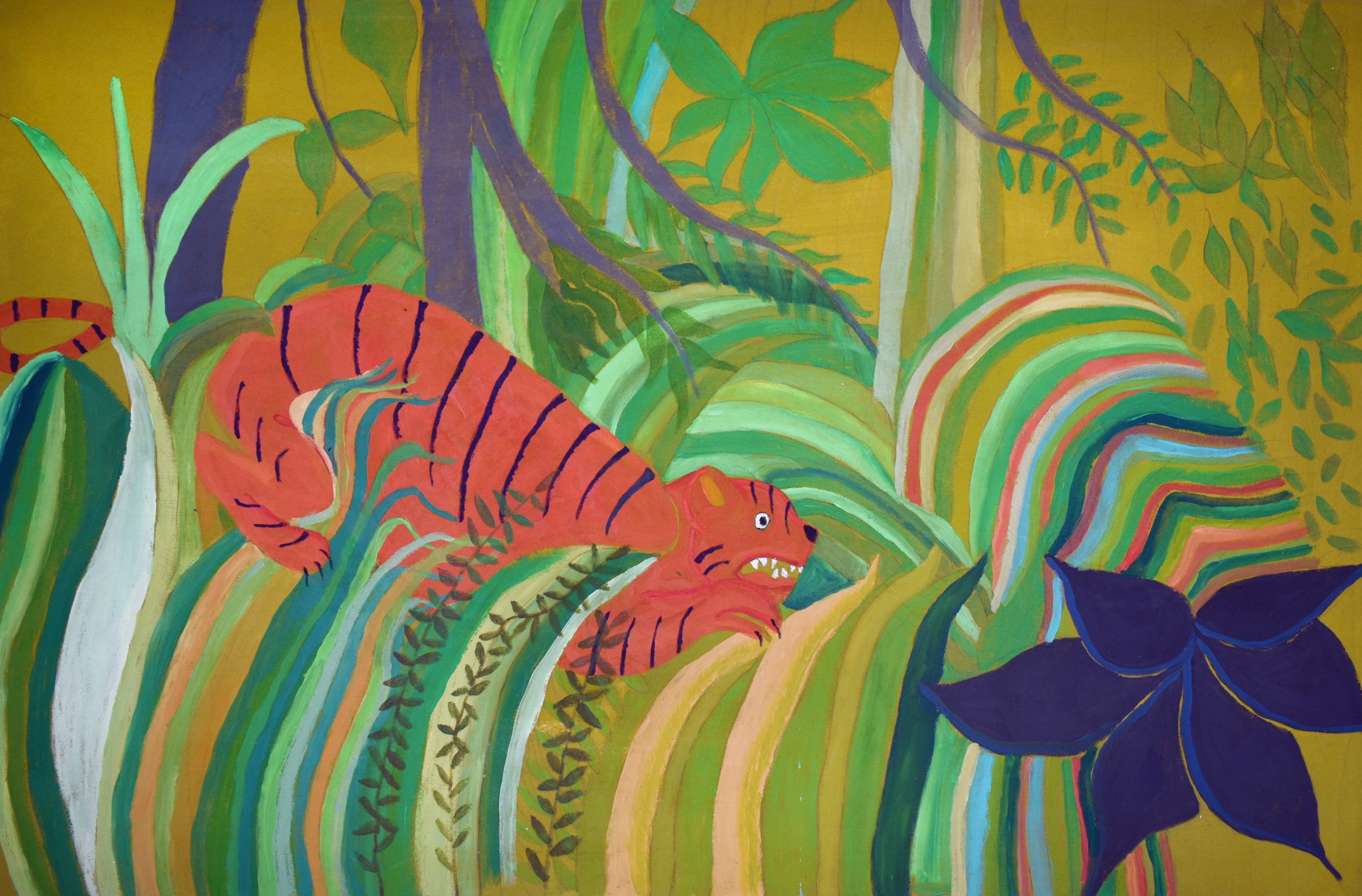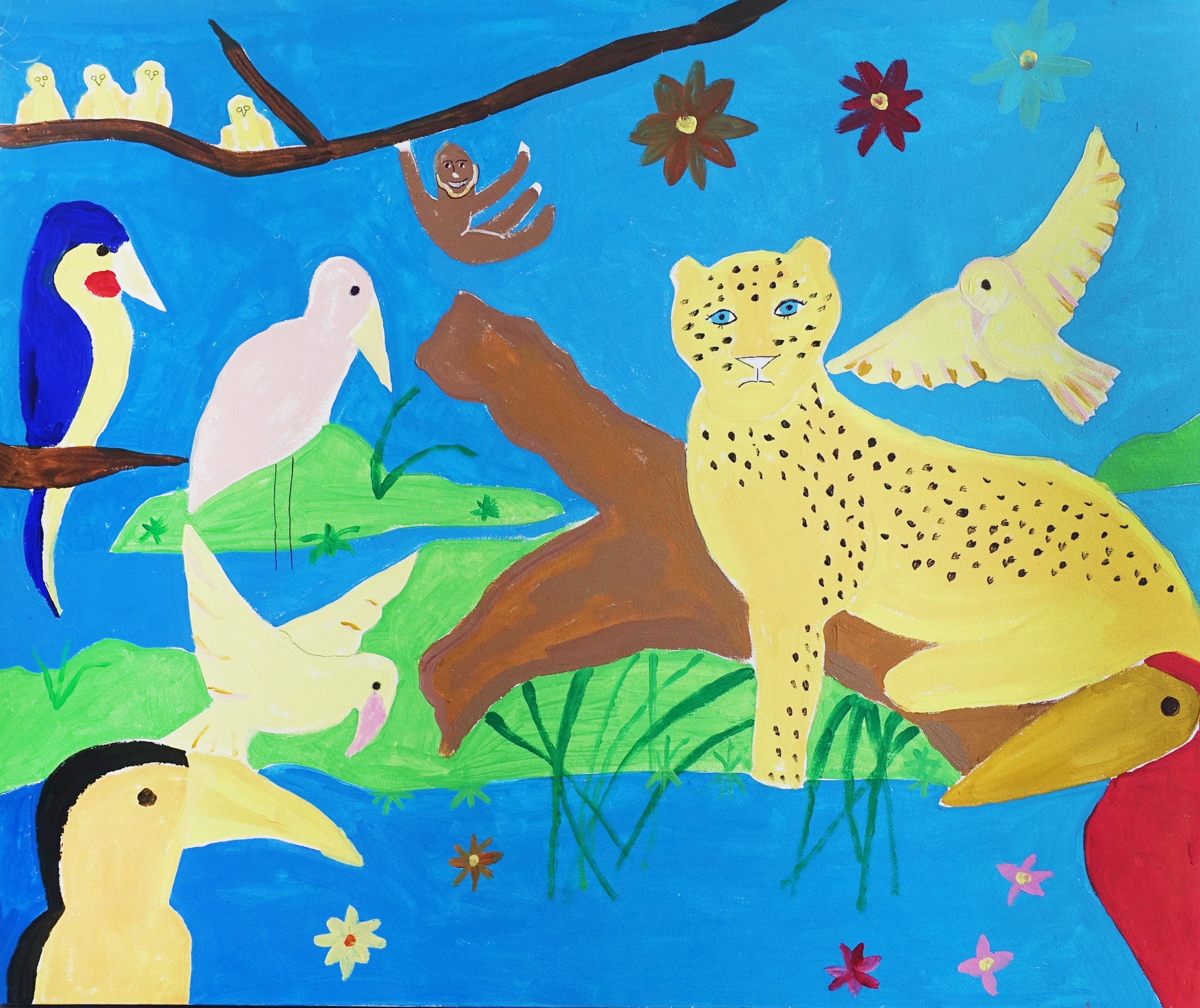 In this latest piece, made on her post-lockdown return to the Project Ability studios, colourful birds surround a stoic leopard – a clear blue sky behind them. Exuding positivity, Marina’s art celebrates the patterns found in nature.