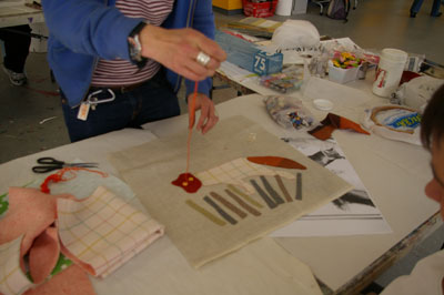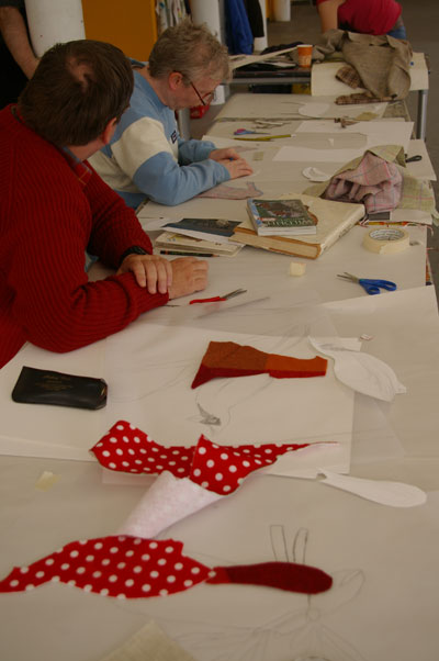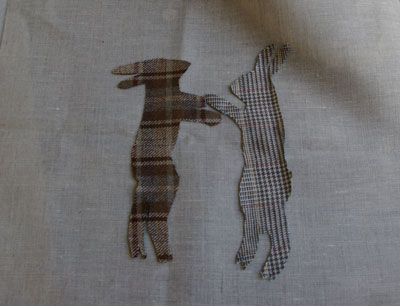 We caught a glimpse of the beginnings of some of the creations earlier today, and found rabbits, foxes and birds cut out of beautiful tweed fabrics, being sewn on to the fronts of cushion covers and bags.