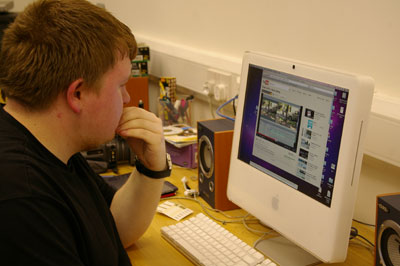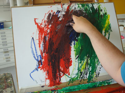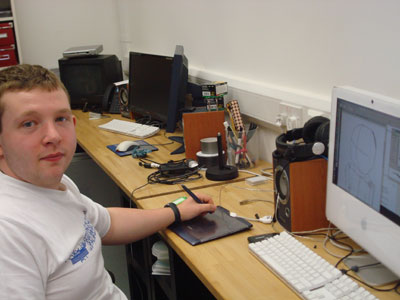 Terry is working away on large colourful drawings on acetate which are inspired by a computer game and which he is going to use in an animation,