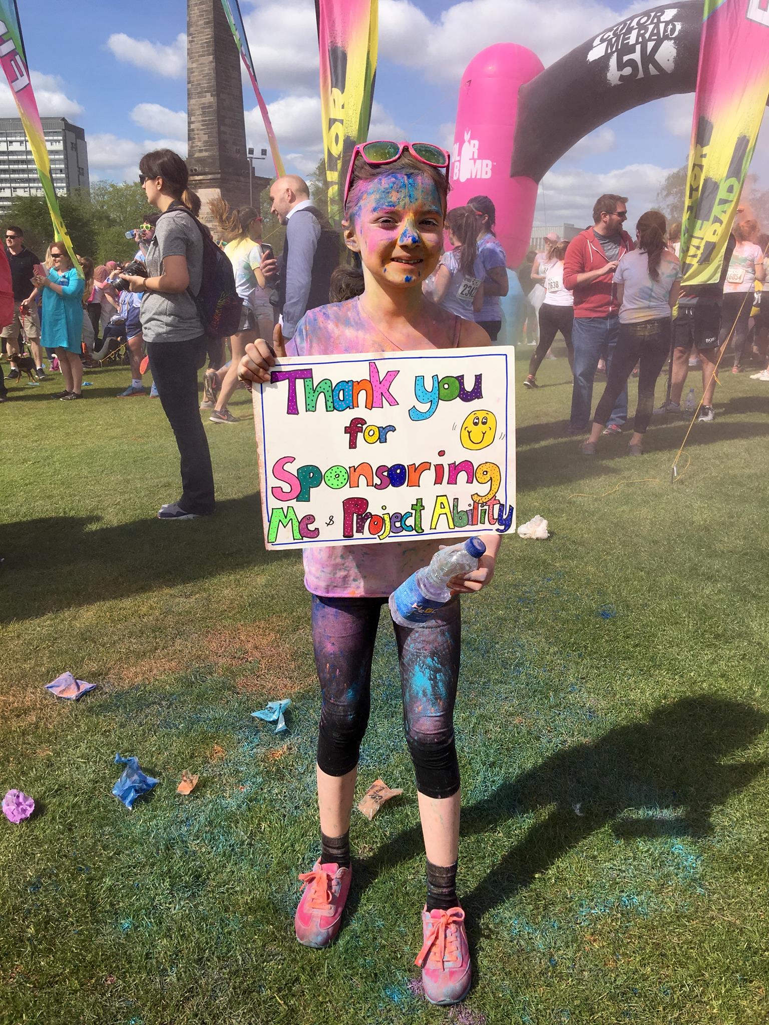 On behalf of everyone at Project Ability, we’d like to say a big thank you to the fantastic Emily Gorman! The eleven year-old ran the Colour Me Rad 5K this past Sunday and raised an amazing £516 for our charity!