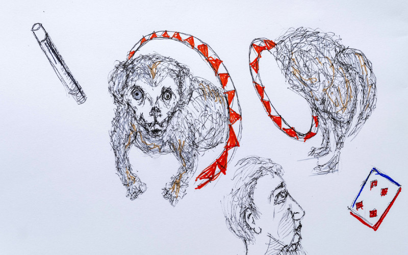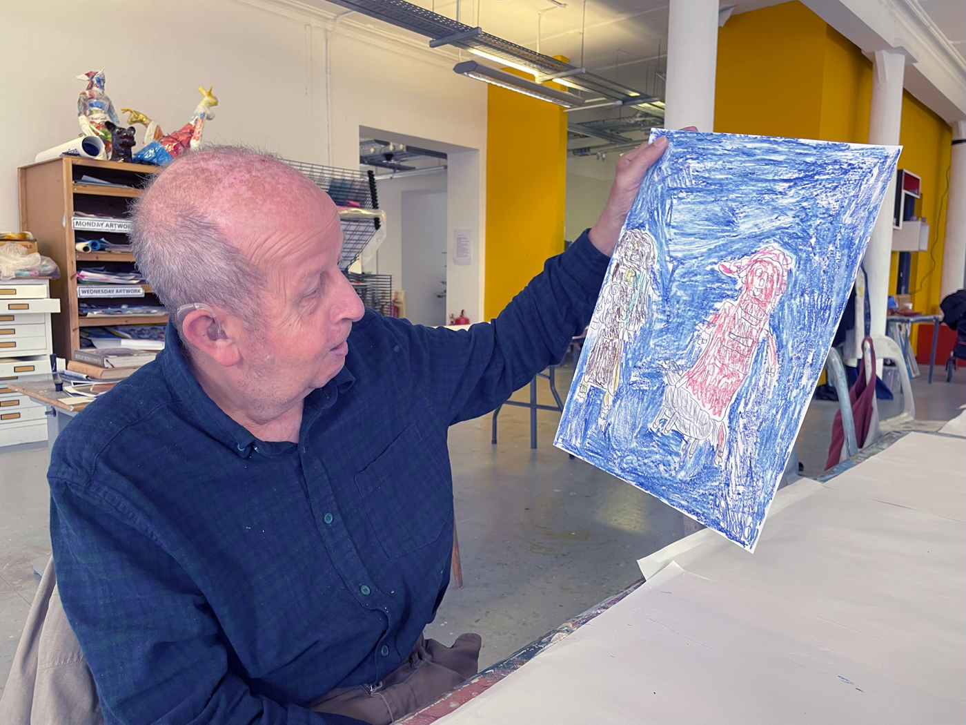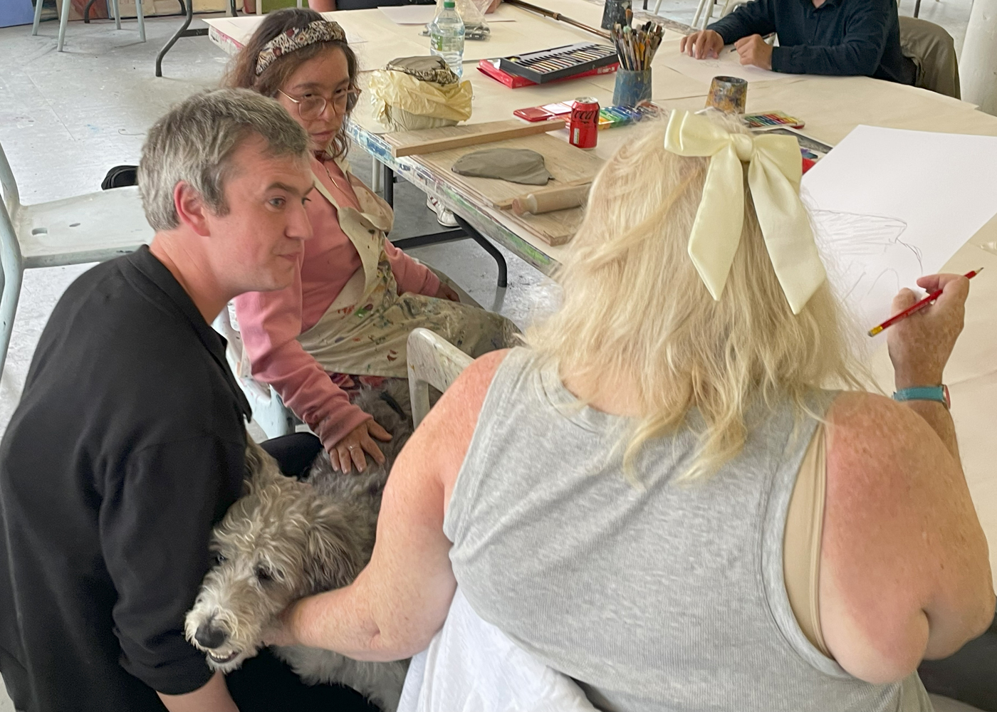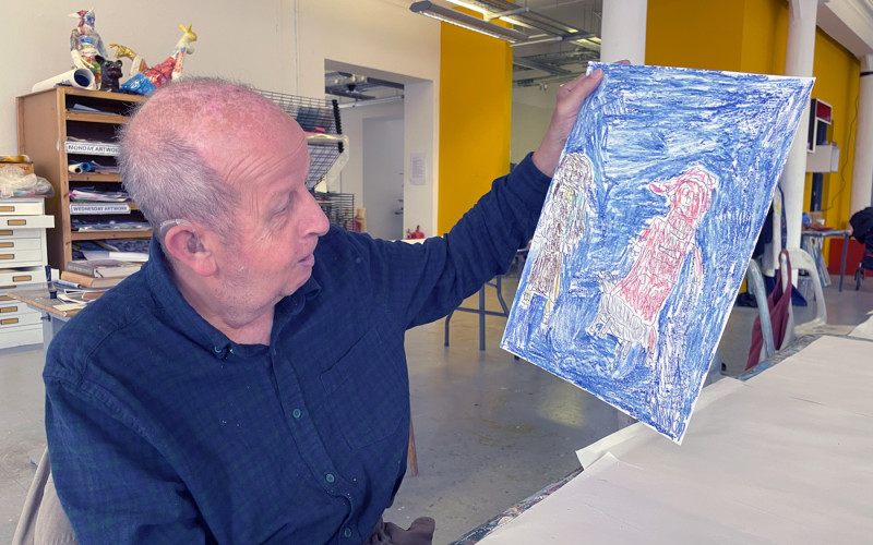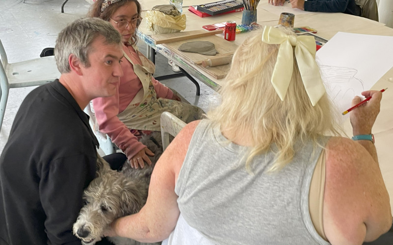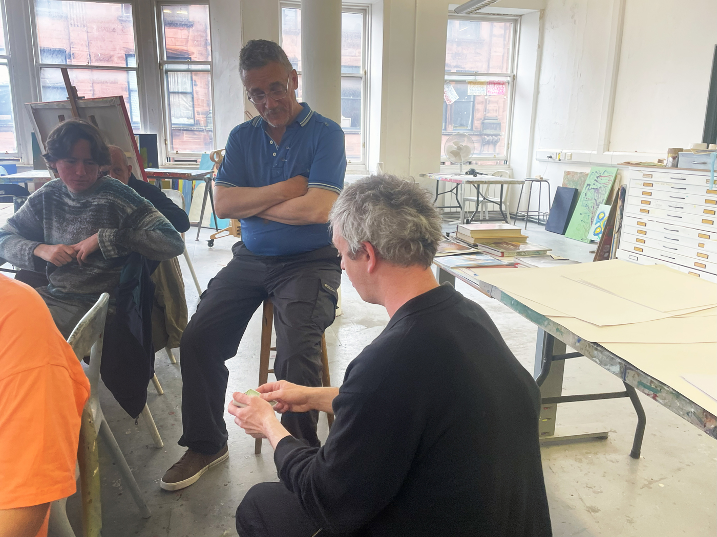 Jack performed some spectacular coin and card magic for the artists; lots of sleight of hand with flying cards and disappearing coins! The artists were asked if they would like to make some artworks and portraits in response to the magic. Manfred was an especially popular model with the Friday group.