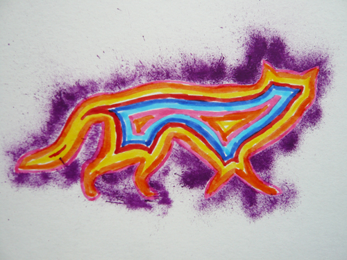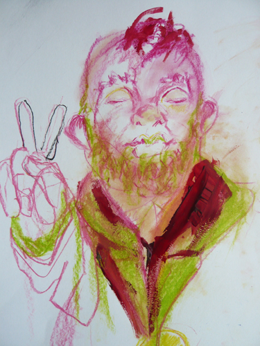 An initial theme was working with silhouette forms to make stencils. Using diffusers the stencils were placed on coloured grounds and sprayed with ink. Over the course of these first five weeks the group have moved on to exploring drawing and painting with chalks, inks and watercolours on paper, with one patient requesting a canvas. The format and media have been a response to the express interests of the participants involved and the nature of the sessions themselves.