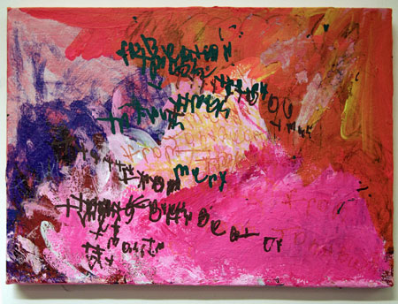 John makes text based works that feature crosses, circles and his own signature as recurrent motifs. This mark making process appears sporadic at first but with every finished piece, John asserts an order and clarity to these unruly sequences by concluding with a trademark signature.