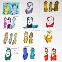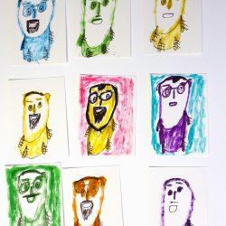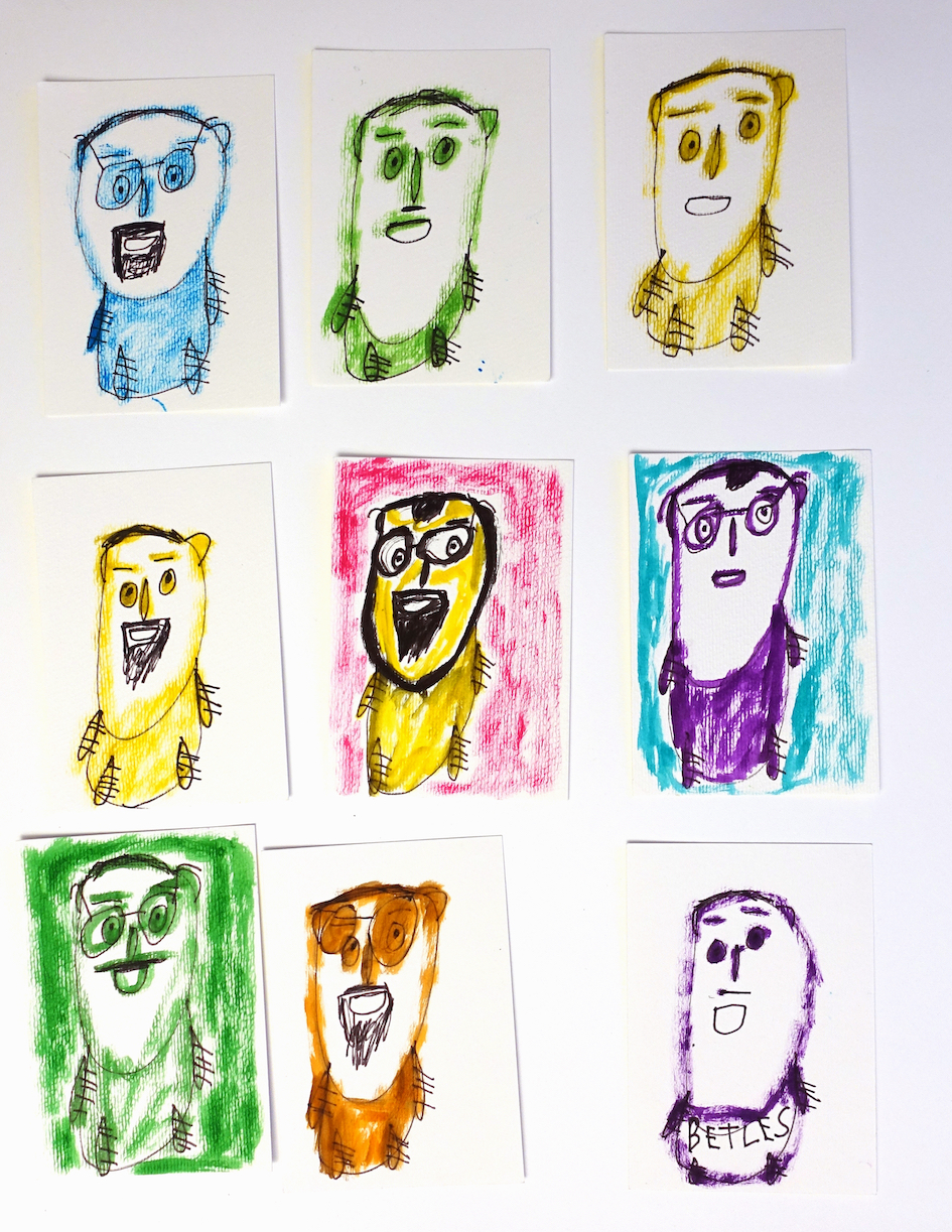 As we continue with our Lockdown Postcards project, we thought it time to unveil our most prolific postcard maker to date! For anyone familiar with Tommy Mason and his artworks, it will come as no surprise that we have amassed close to 100 postcards by Tommy Mason since the first Lockdown began. All in his most recognisable and loved style. We have a huge variety of characters here, some labeled, some not. It’s clear that some of these figures reference the old films Tommy Mason loves to watch, and which he has been watching all the more of during lockdown. An old western is probably his favourite, though the mafia film characters do make an appearance.