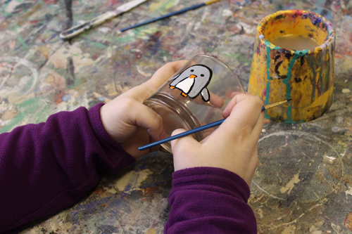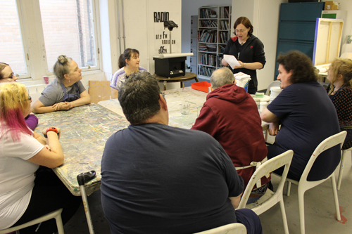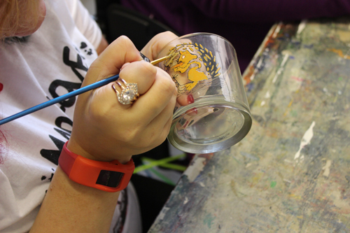 Following the talk Rachel led a workshop in our studios introducing participants to glass transfers or decals, and some glass painting techniques. Rachel had prepared some decals that had been made from drawings by Project Ability artists. The group learnt how to adhere these to small tumblers, as well as how to work with enamel paints to add additional detail and colour. These will now need to be fired again in our kiln and then they will be safe to use for drinking out of.