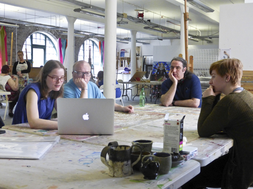 I am currently working with a group of ReConnect artists to make drawing, writing, collage, and photographs exploring the theme ‘studio traces’. Through the workshop we’ve been thinking about the potential significance of the incidental marks that we leave behind in the process of making work. We’ve also been talking about the wonderful and important feeling of community in this studio. We will bring the work together to make a digital publication.