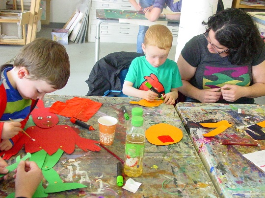 Today saw the first of our Puppet making workshops to celebrate this year’s Merchant City Festival. This busy workshop was a hive of activity, with everyone involved creating their own wonderful and wacky creatures in paper puppet form. All our participants worked very inventively using a variety of coloured cards and papers, and embellished their creations with coloured sticky back plastic, buttons, sequins and googly eyes!