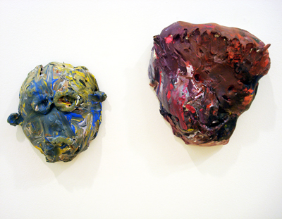 Today is Friday the 13th and with the day’s foreboding reputation for widespread superstition we bring you these two mysterious characters, masks made by Lachlan Mulheran and Vincent May. These two intriguing pieces, one red-purple by Vincent May and the other blue-green by Lachlan Mulheran, are made from ceramic and layers of acrylic paint to obtain their rough appearance. The masks’ ‘painted skins’ share a varied viscous surface but have their own hauntingly allusive characters achieved through a splendidly untidy reworking of paint.