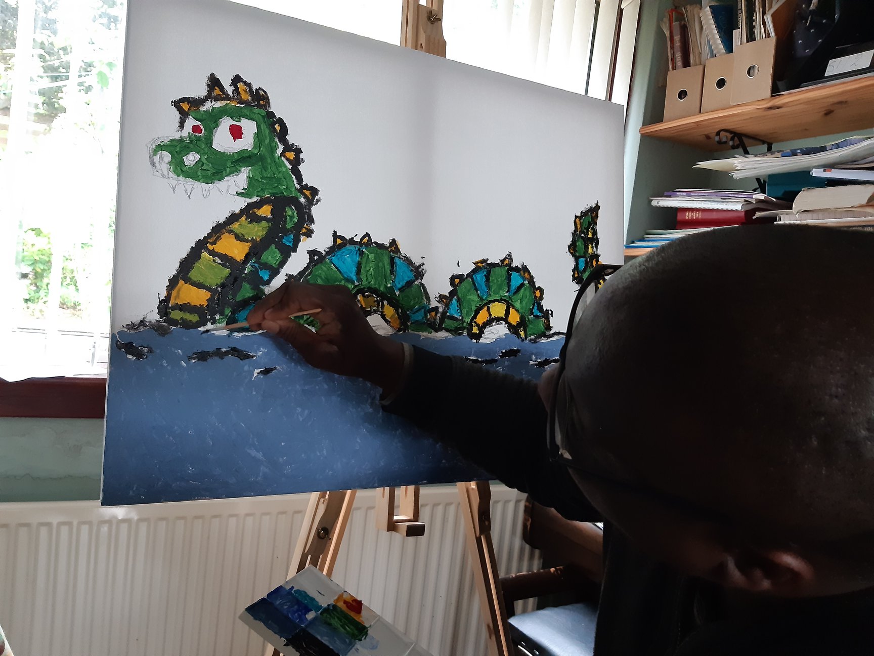 Obi painted Nessi during lockdown on a large canvas (see images below). You might remember this talented young artist from his solo exhibition last year and some very adorable animal paintings and dog cushions? 😀