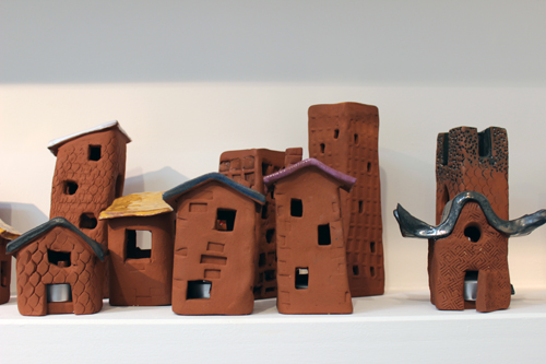 The ceramic items include some flowery tiles, an Irn Bru bottle and can, puffins, westies, and a village of tea-lights holders.