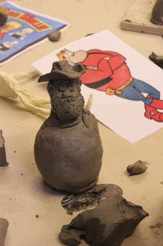 He added the hands, the head and the spicky hair! The sculpture is now waiting to be glazed and fired.