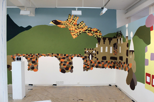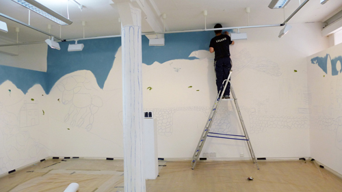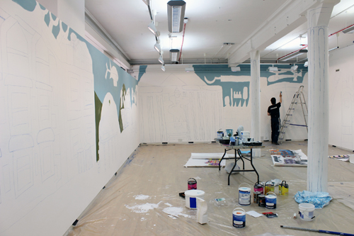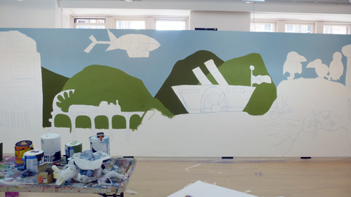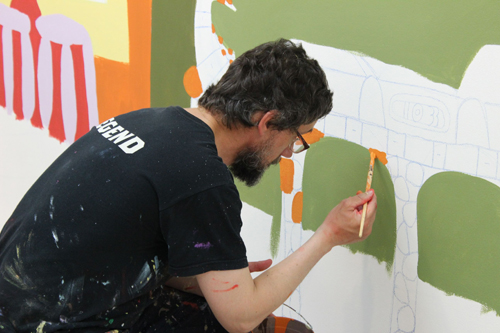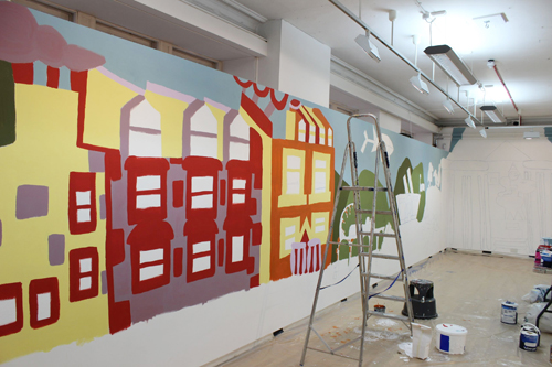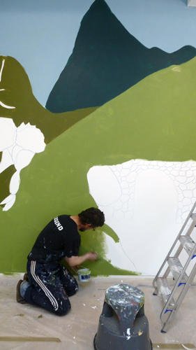 The artist started painting the walls, blocking in colours for the sky and other green spaces. He then moved on to more detailed areas, adding splashes of colour to the houses, rocks, etc.