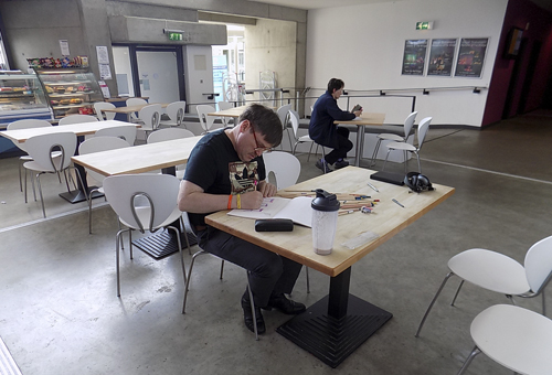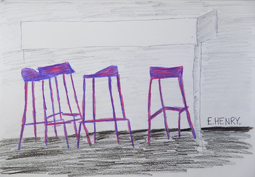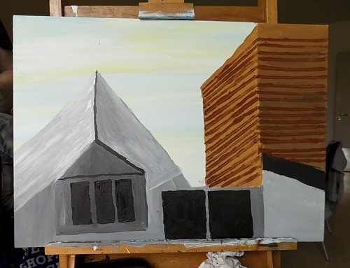 After painting in the windows and doors, Edward added people using oil pastels. He used his earlier sketches of the beauty therapy students for this.