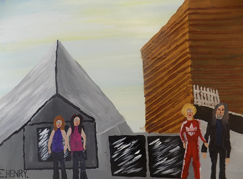 Edward then finished off his painting of one of the entrances by painting in figures. He used a previous sketch of some beauty therapy students as the basis for two of the figures. He added another couple of figures which are based on lecturers that he knows from the Glasgow Kelvin College campus next to Platform.