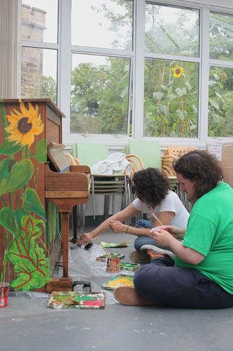 Based in The Summerhouse and The Walled Garden, they were inspired by the location, the mature gardens and more recent plantings and drew on their surroundings to produce a series of botanical drawings which were translated onto the fabric of a piano which is on loan to the hospital from the Glasgow Piano City project (www.glasgowpianocity.org).