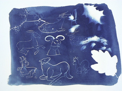 Week 1. The sky was overcast with a persistent drizzle of rain and not ideal conditions conducive for working with cyanotype which is a process that needs sunlight! Instead of printing the group prepared the surfaces and painted silhouettes upon which could be placed objects found in the garden, like leaves, ferns, feathers, flowers etc. These objects foraged from the garden would then make shadows that would form a cyanotype print.
