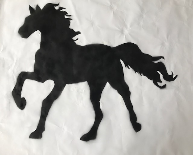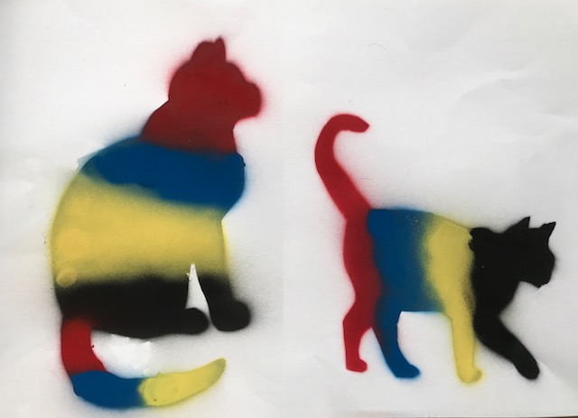 “First the children draw their chosen images onto card which I carefully cut out. We then take their work outside to the garden to work with spray paints of varying colours and overlapping chosen areas creating more depth” – Iona Grey