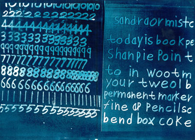 Our Artwork of the Week is this cyanotype text work by Sandra Ormiston. Sandra’s main interests are drawing and writing and she creates works that portray her everyday life. Words and numbers seem to scuttle and dash across the page and Sandra creates a very urgent poetry in her works that are both illustrative and whimsical.