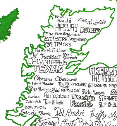 Michael Earll’s ‘A Musical Guide to Scotland’ is our Shop Item of the Week! The original drawing by Earll is in our current exhibition, Scotland: The Land Beneath Our Feet . The drawing measures 40x28cm and can be purchased for £65. If you would like a poster print of the artwork you can find one in our online shop! Priced at £10, the A4 sized laserjet print on card is a must have for any Scottish music lover. The artist has meticulously inscribed a countless number of Scottish bands into this small map, and the result is beautiful. We can provide different sizes of this print, but if you’d like an A4 print, you can visit our online shop now. Perfect Christmas present!