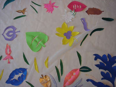 ‘The Spring Banner workshop began with participants drawing from botanical illustrations, then they developped their drawings onto coloured and bonded fabrics, using paper cut techniques.’