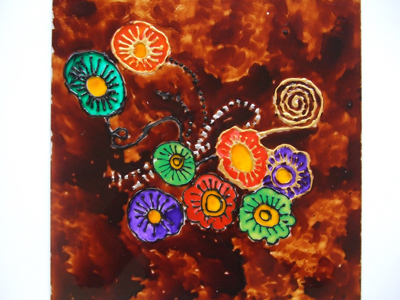 Participants taking part in Project Ability‘s workspace learnt about stained-glass techniques and were able to experiment with their own ideas. The technique was glass outliner and paint on perspex squares to create a stained glass (cheat) effect based on 1960’s textile fashion design
