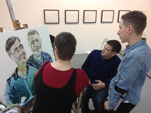 “I was really looking forward to coming back to Project Ability to see what they had done with the work I’d made during my residency back in March 2015 and I wasn’t disappointed! The exhibition of the portraits I’d made of many of the Aspire Artists and of the artists and delegates who came to the International Learning Disability Arts Summit really reflect what a great time we all had sharing our art and culture. I love the way the exhibition reflects the many people I encountered and the different painting and drawing techniques I explored during my residency, including iPad drawings, eye dropper ink drawings, and acrylic paintings on watercolour paper and on canvas. Plus the work had been hung at a wheelchair height. Perfect!