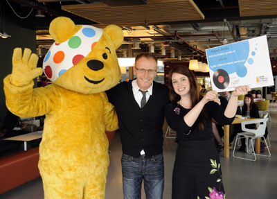 Photograph: Pudsey and BBC Radio Scotland’s Bryan Burnett presenting the BBC Children in Need plaque to Project Ability, courtesy of BBC Children in Need.
