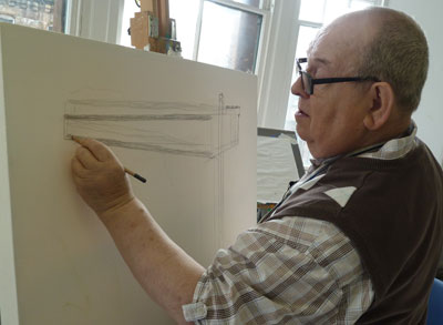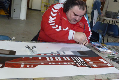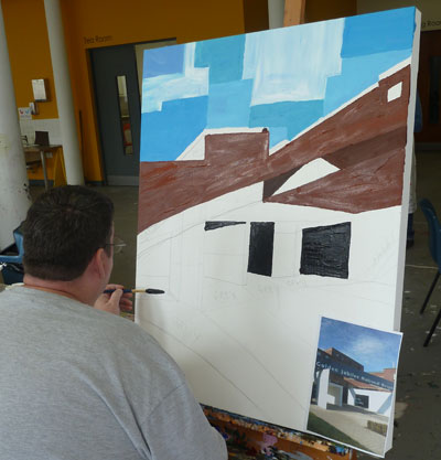 Since then the group have met every Monday at Project Ability’s studio to develop their ideas for their final pieces. Cameron has been drawn to the drama of the operating room while John McNaught is exploring the buildings modernist architecture and Robert McCamley is working on iconic Clydebank landmarks positioning the hospital firmly in local the environment.
