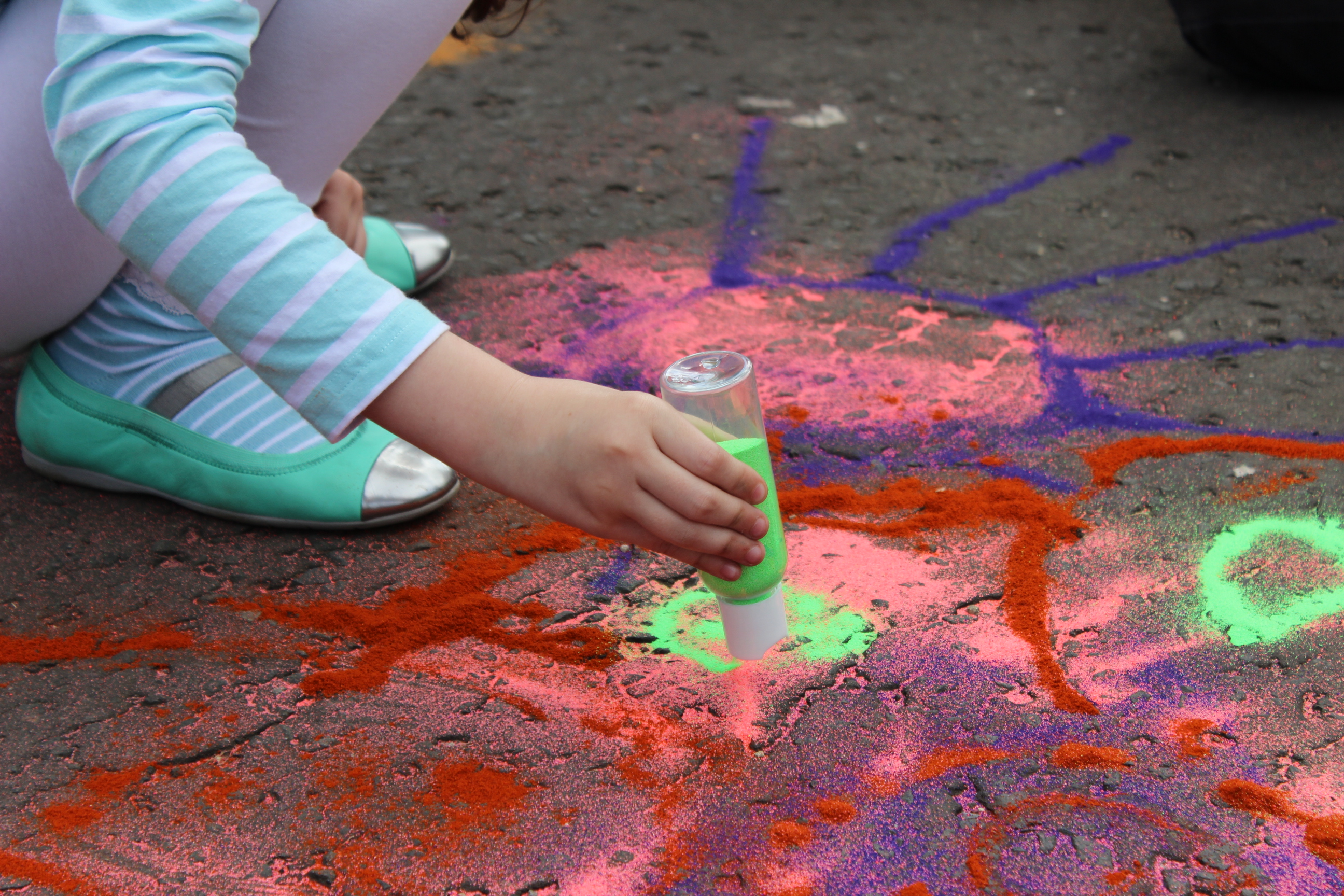 They got stuck in right away, decorating the ground with lots of big, bold, colourful designs. The weather was perfect and we even had members of the public having a go. I tried making a hopscotch pattern, but by this point there wasn’t much sand left- resulting in the smallest squares ever. Not much of a challenge then, but a pretty fun way to spend a sunny Saturday morning!