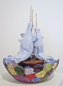Leona works primarily with acrylic paint, usually landscapes dotted with people, animals or houses. Recently she has begun experimenting with large, sculptural projects. She studies other art and develops her work slowly, committed to whatever project she is working on. She describes it this way: “It’s like I drowned, I drowned in my own art. It’s a great feeling!”
