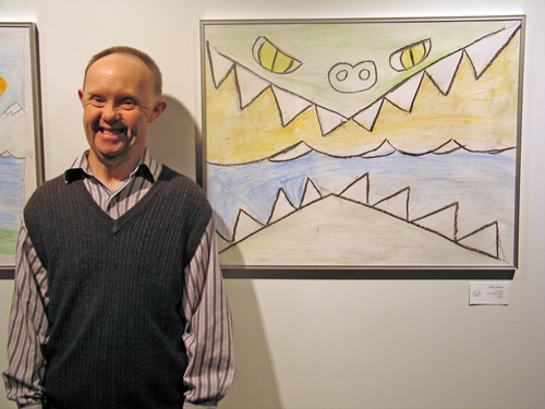 Showing his art is a special treat for Randy, there is a sense of pride in knowing that others enjoy what he creates. Randy says, “I draw all day. That’s what I like best to do. I draw at my Mom and Dad’s, I draw at the group home, I draw at the Centre. I have my own sketchbook. I draw all kinds of things, dinosaurs and dinosaurs being born, people, people holding up buildings, my ex-girlfriend Katie. Ideas come from my head and from photographs. I like to fill up the page. Two of my drawings were put on t-shirts.”