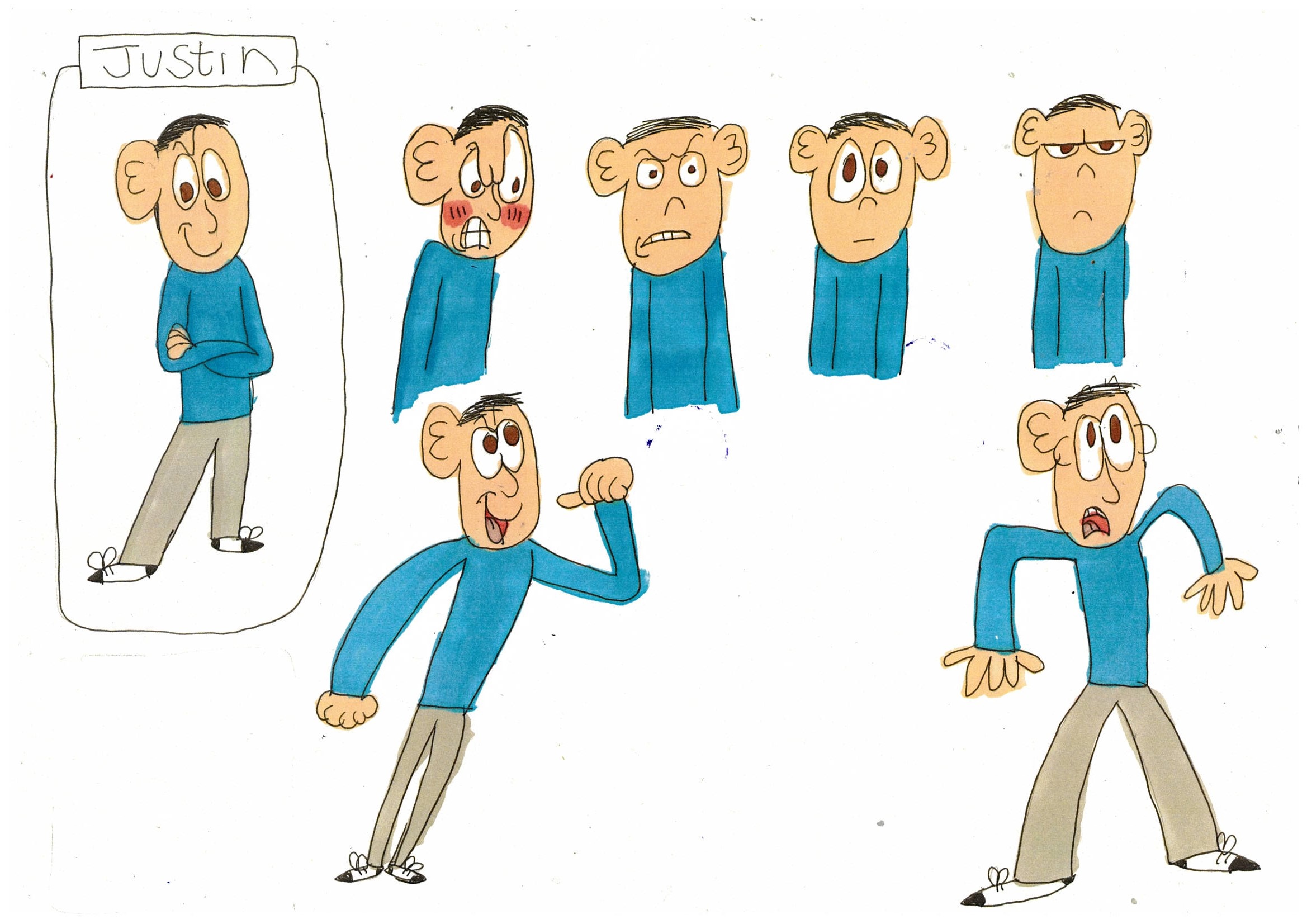 Justin has a unique drawing style and his stories and illustrations mainly feature his family and friends, a villain of some description and often feature himself as the main character. In addition to drawing he has a keen interest in watching animations, especially Pixar and Aardman animations, which are a huge influence on his work. Although only 18 Justin has already had some success with his artwork, gaining a commission from Children in Need in 2012 to make Terry Wogan’s 70th birthday card and having his artwork shown as a backdrop to rock band ‘Inspiral Carpets’ gigs.
