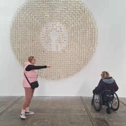 We then went into the larger gallery and were treated to one of the most interesting installations I personally have ever seen! Iza Tarasewicz latest work is made using old farm equipment, metals, clay, spices and wheat. Her inspiration is the history of her family farm in Koplany, Eastern Poland. She draws from the 16th century and the musical beat workers used to gather the wheat. Her installation is a fascinating mix of swirling vortexes, what looks like a vibrante golden sun, mobiles of old rusted equipment and smaller structures holding wheat. Both exhibitions continue into next year and details can be found at tramway.org
