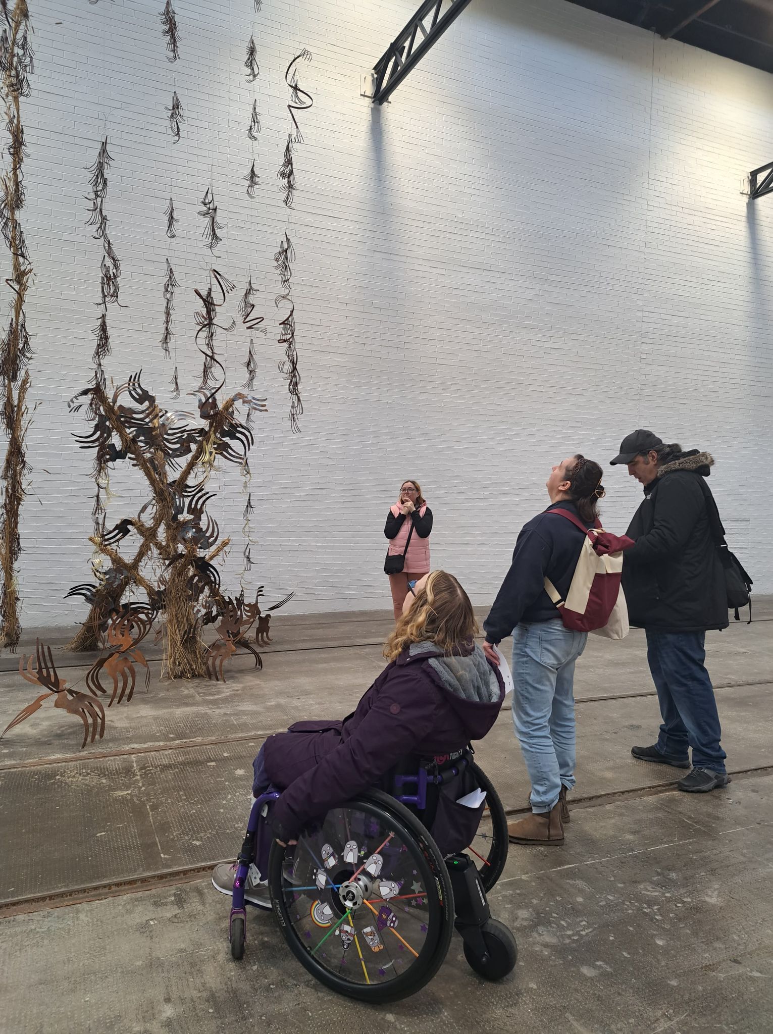 We then went into the larger gallery and were treated to one of the most interesting installations I personally have ever seen! Iza Tarasewicz latest work is made using old farm equipment, metals, clay, spices and wheat. Her inspiration is the history of her family farm in Koplany, Eastern Poland. She draws from the 16th century and the musical beat workers used to gather the wheat. Her installation is a fascinating mix of swirling vortexes, what looks like a vibrante golden sun, mobiles of old rusted equipment and smaller structures holding wheat. Both exhibitions continue into next year and details can be found at tramway.org