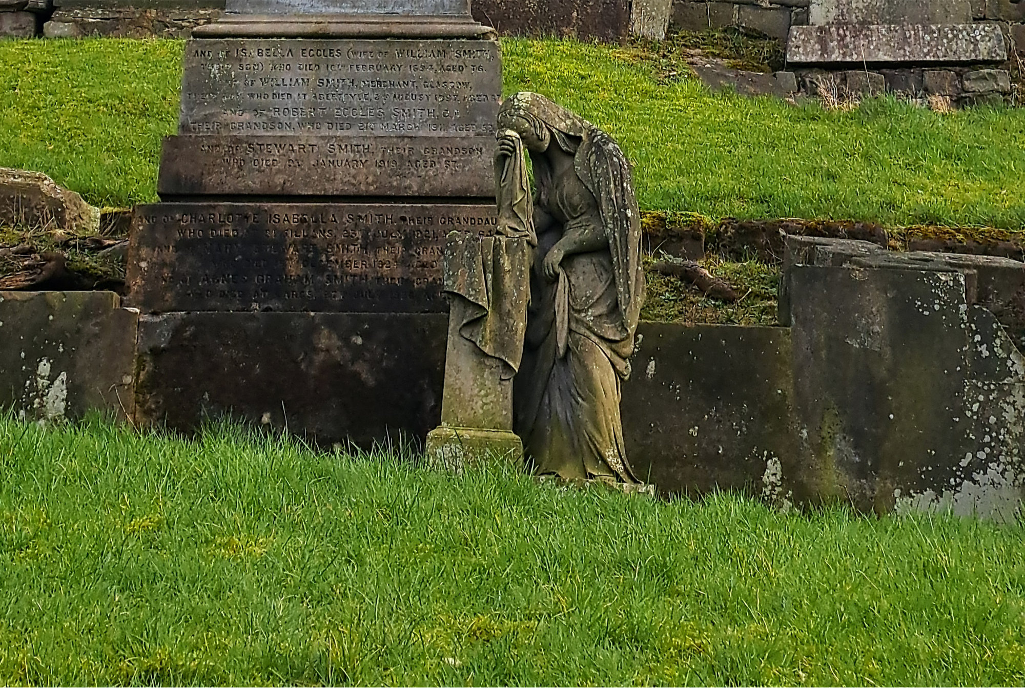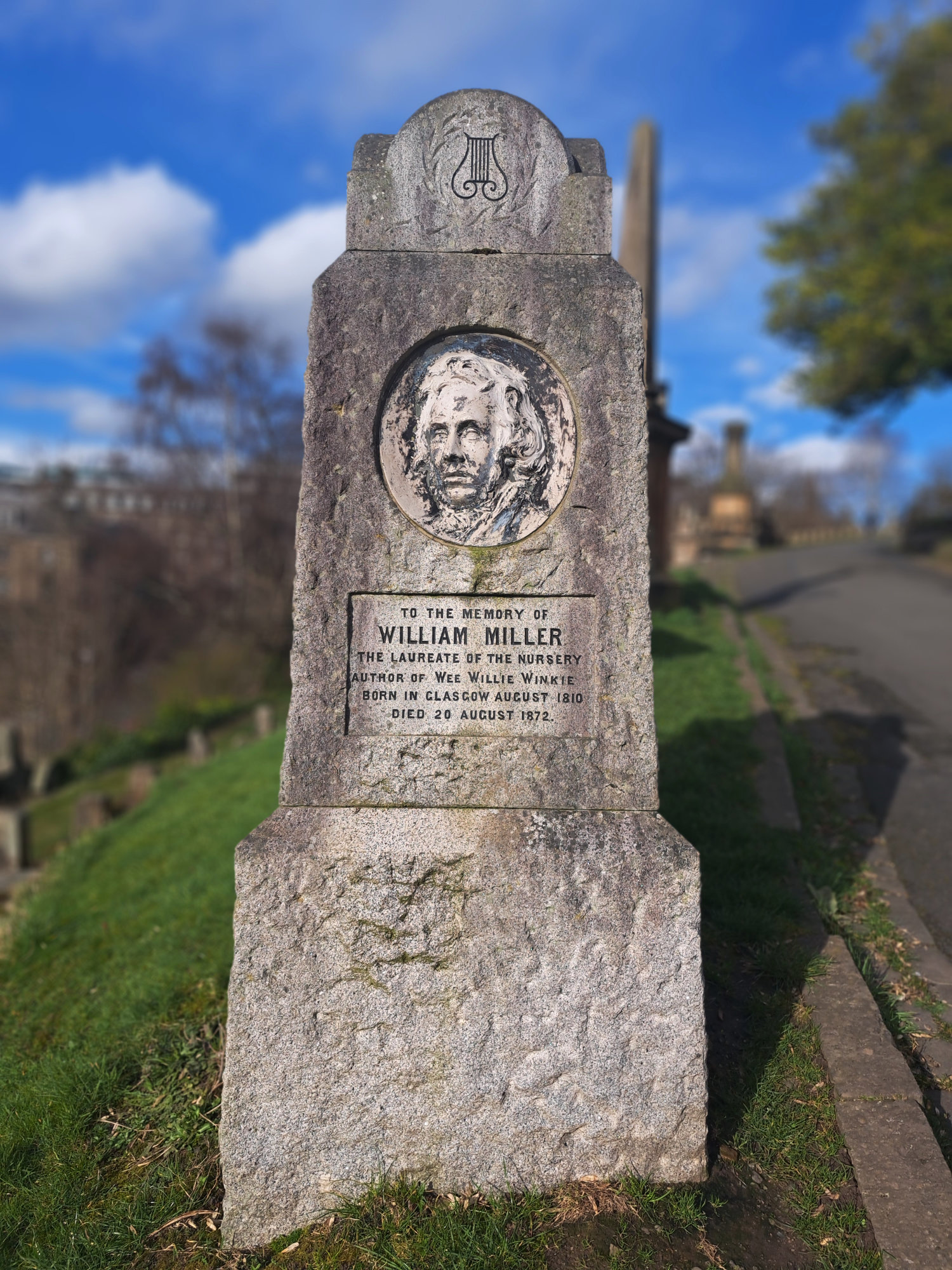 The necropolis is the final resting place of more than fifty thousand individuals over almost two hundred years. Fewer than a tenth of these lives are marked with headstones or monuments of any kind. Amongst the great and the good to be commemorated, we spotted the headstone of William Miller, author of the well known nursery rhyme ‘Wee Willie Winkie’. We spent a while admiring the magnificent monument dedicated to the memory of the actor John Henry Alexander, with its ornate sculptures representing tragedy and comedy and an epitaph that begins with ‘Fallen is the curtain – the last scene is o’er: The favourite actor treads life’s stage no more…’