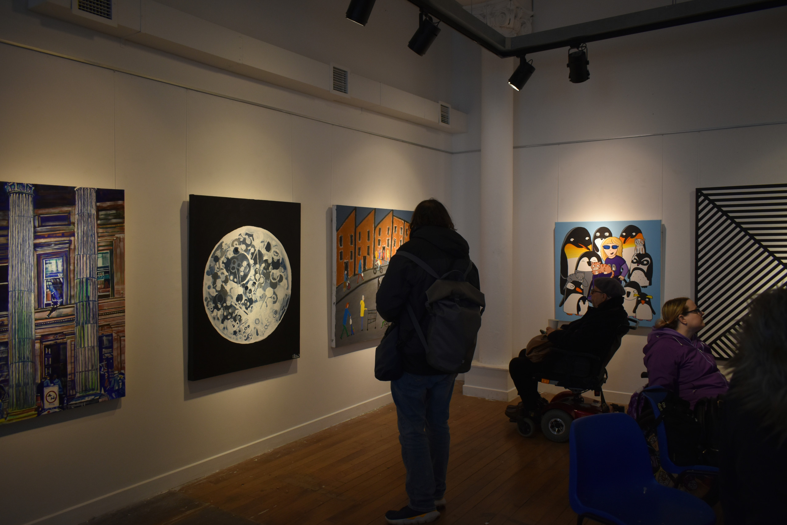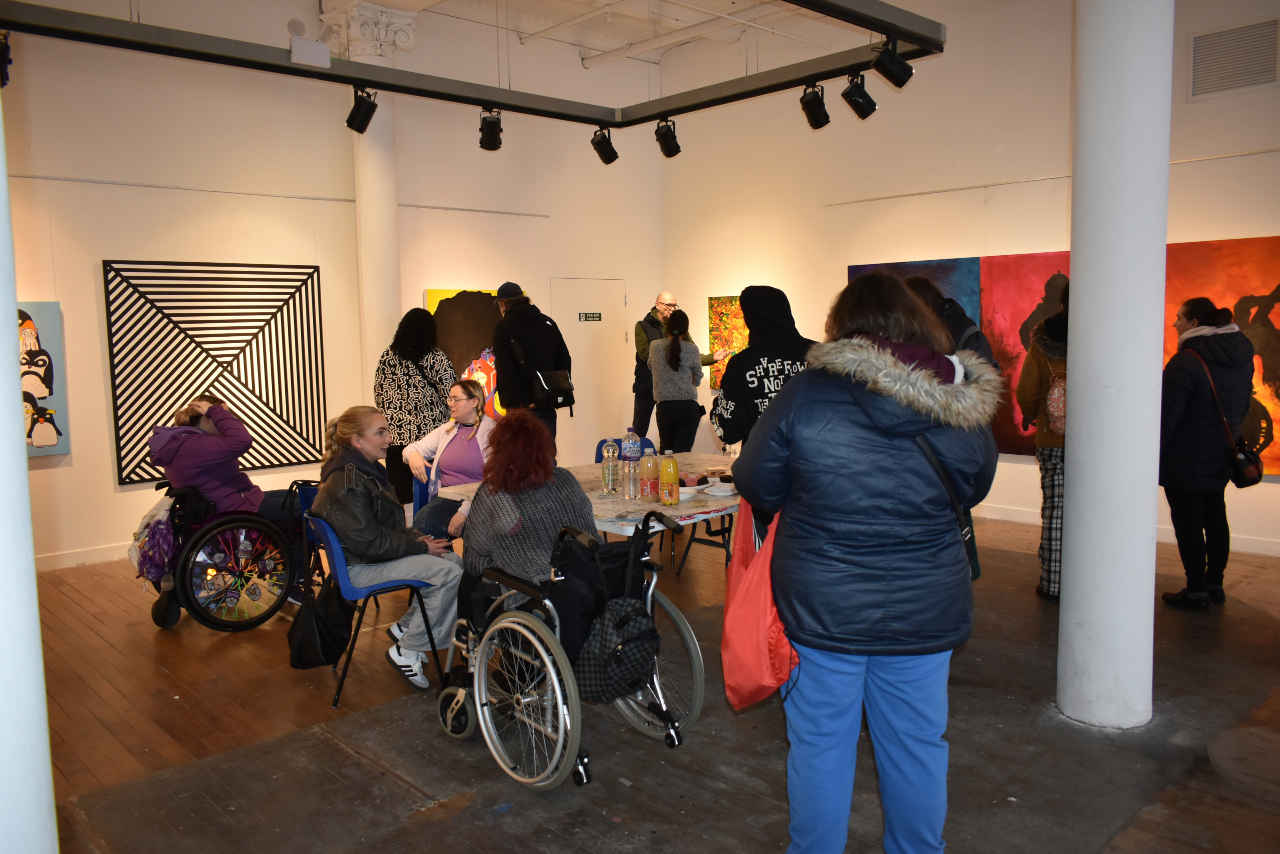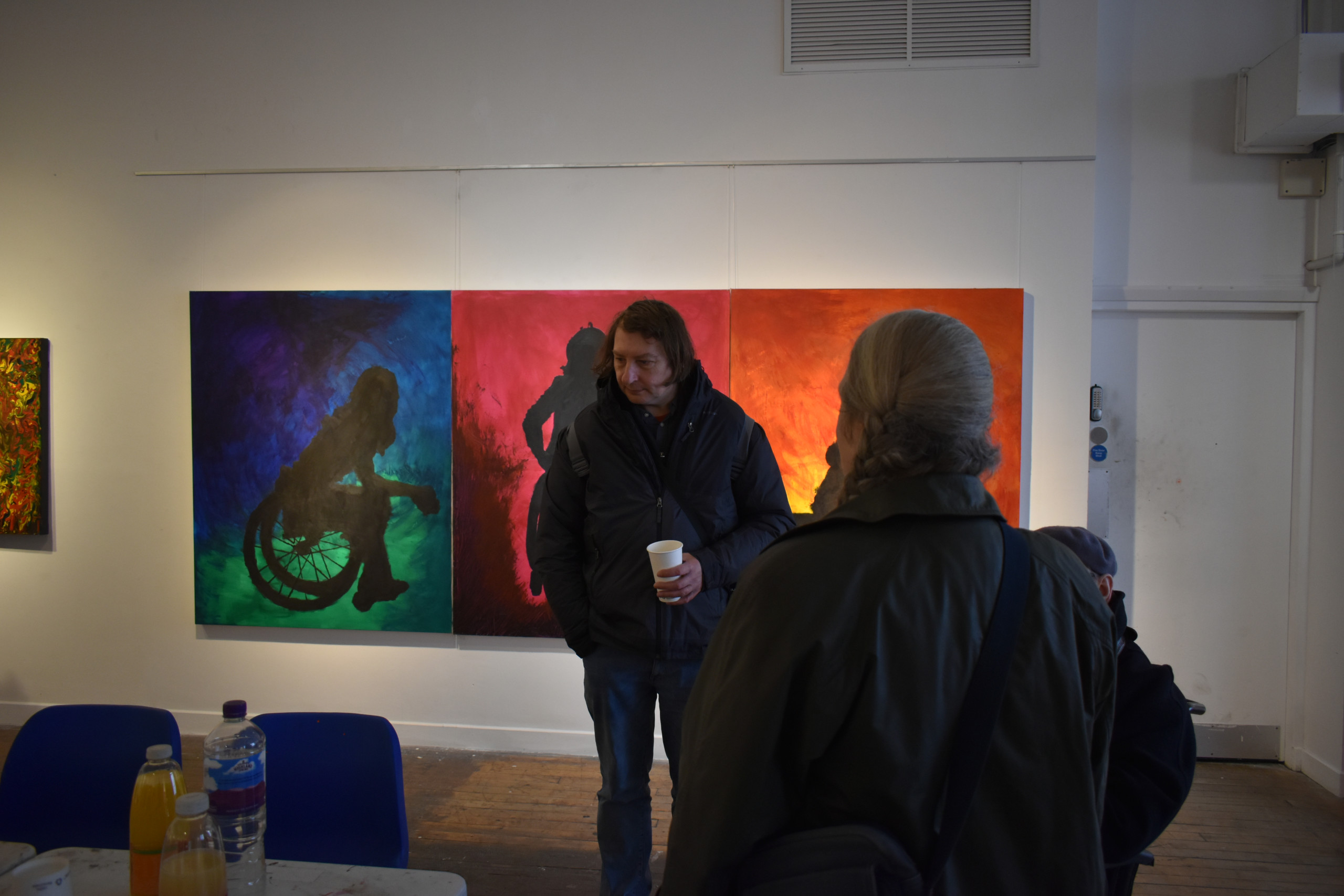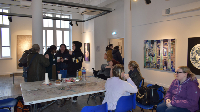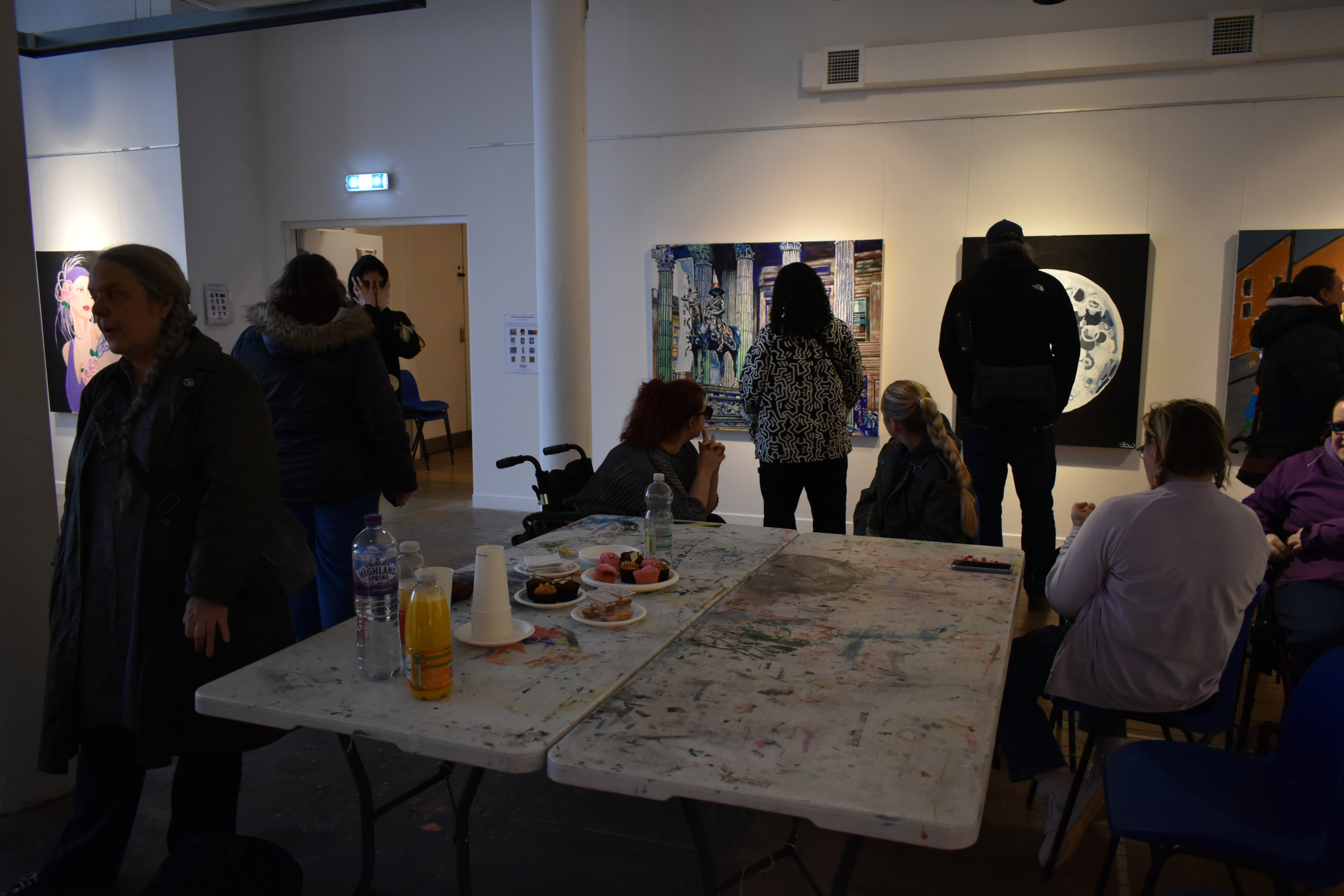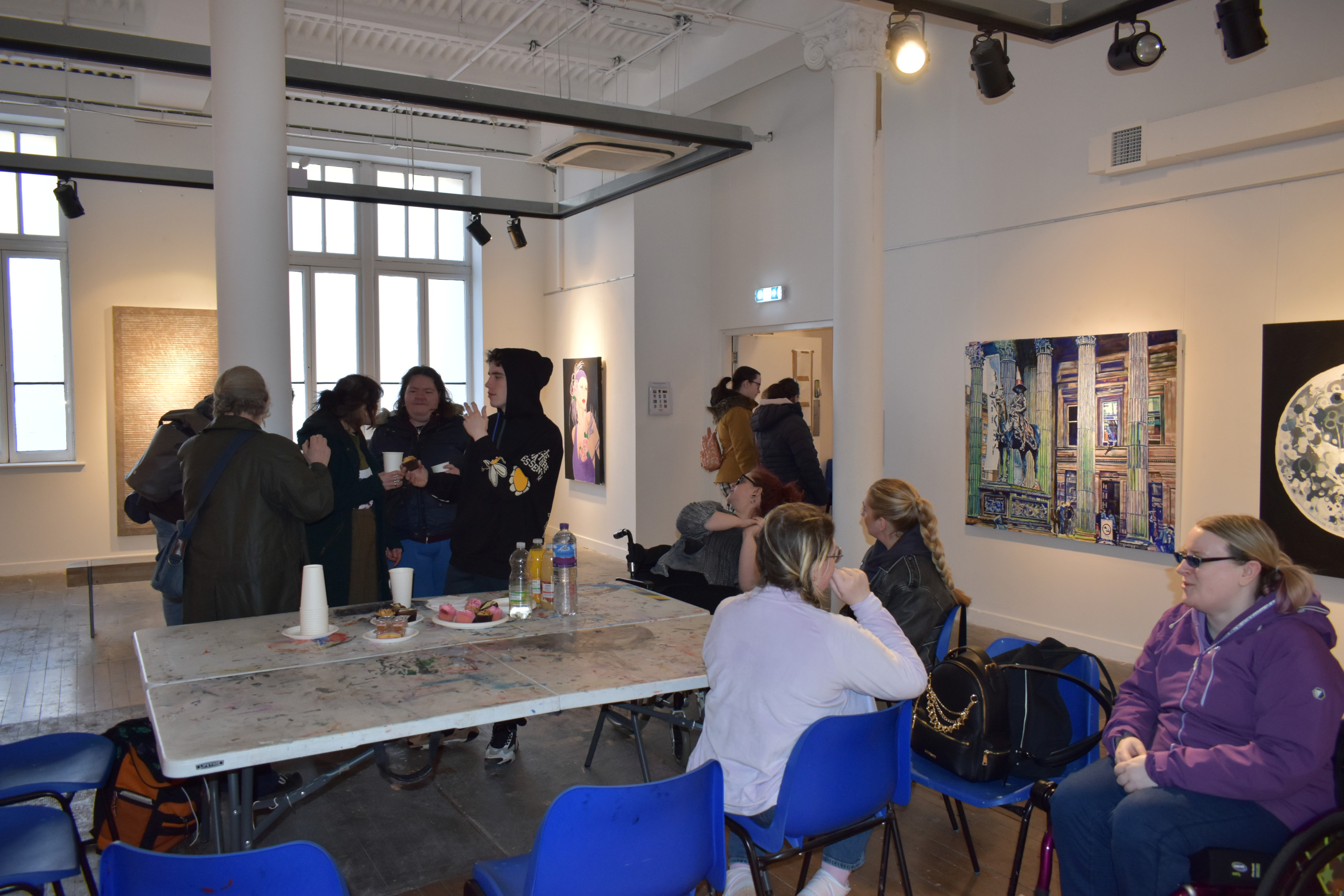 On Wednesday the 17th April the Walking Group visited the Glasgow Art Space in Cass Art to see some of the large paintings that had been at Platform. The scale of the work is much more obvious in this smaller space and we were able to really take in the smaller details on some pieces. We were also treated to a drink and cake, having a little tea party to ourselves. A few members of staff and artists who had work exhibited joined us and it was a lovely afternoon. The work is there until April 25th.
