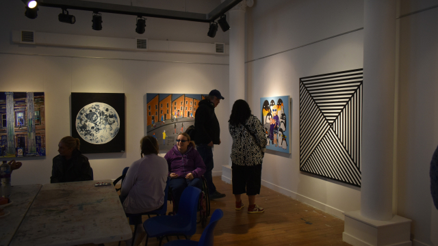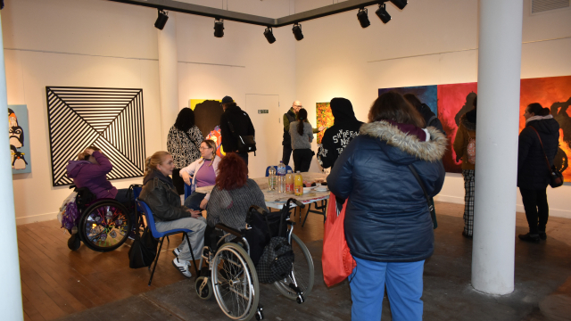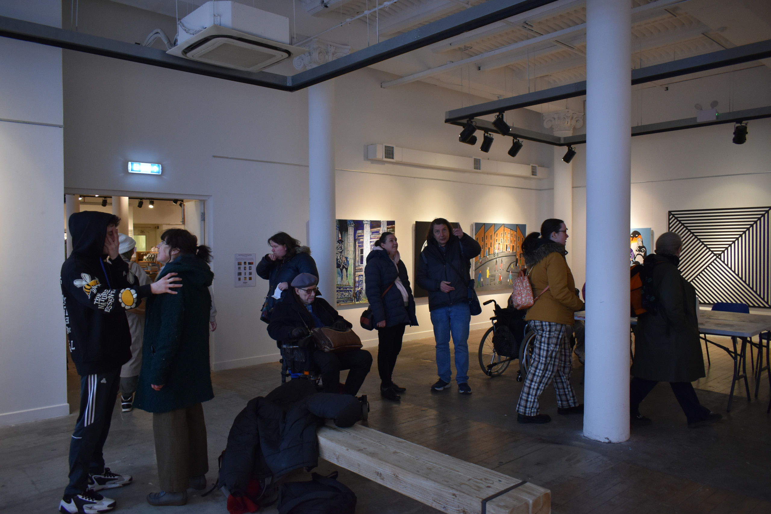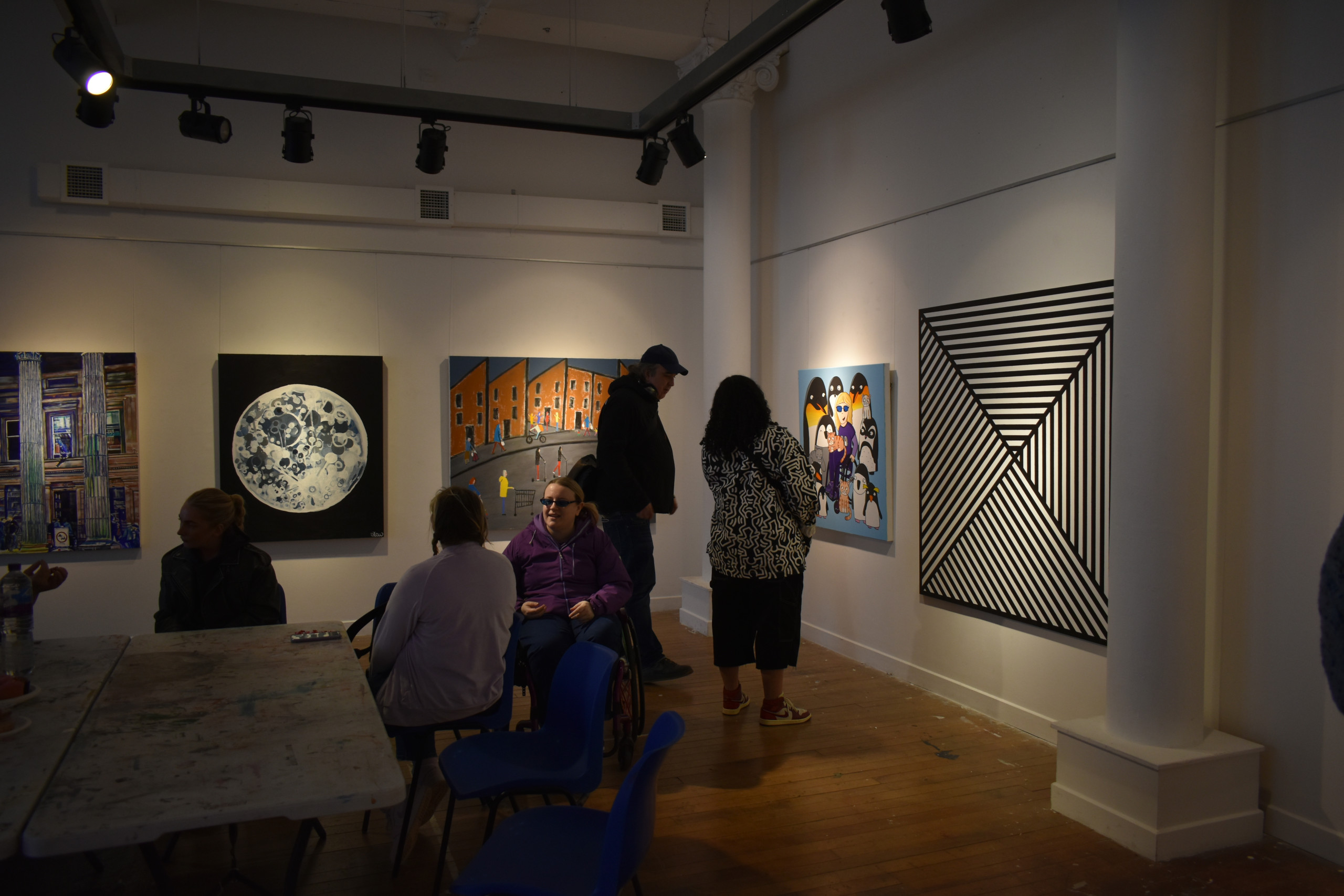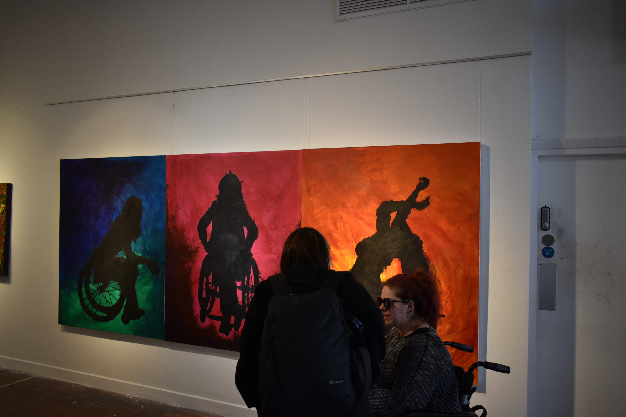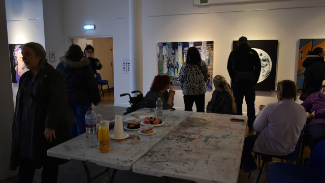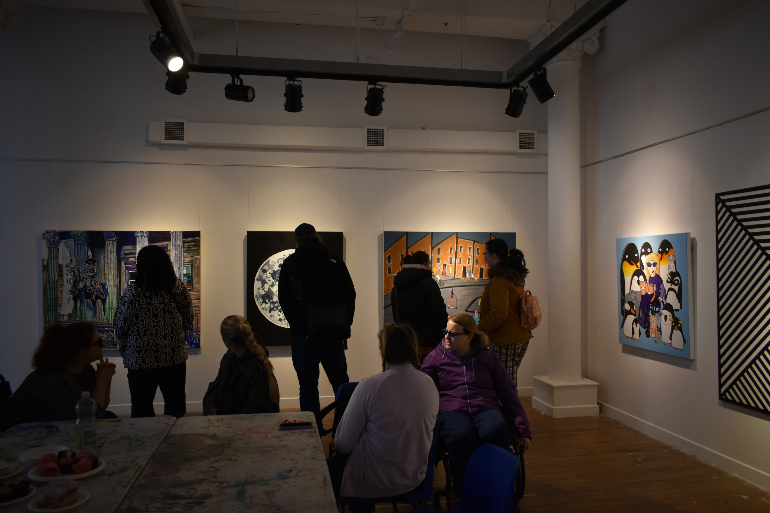 On Wednesday the 17th April the Walking Group visited the Glasgow Art Space in Cass Art to see some of the large paintings that had been at Platform. The scale of the work is much more obvious in this smaller space and we were able to really take in the smaller details on some pieces. We were also treated to a drink and cake, having a little tea party to ourselves. A few members of staff and artists who had work exhibited joined us and it was a lovely afternoon. The work is there until April 25th.