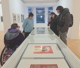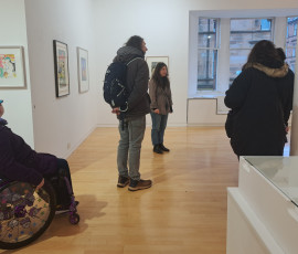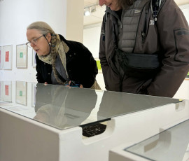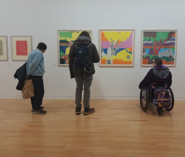 We were welcomed into the gallery by Hannah who gave us an overview of the works and we were especially taken by the laser cut woodblock prints. We were pleased to see that the artwork information was at a good height on the wall and had a chat with Hannah about the glass topped cases that were just a little bit too high for our wheeler Ruth to see the contents well.