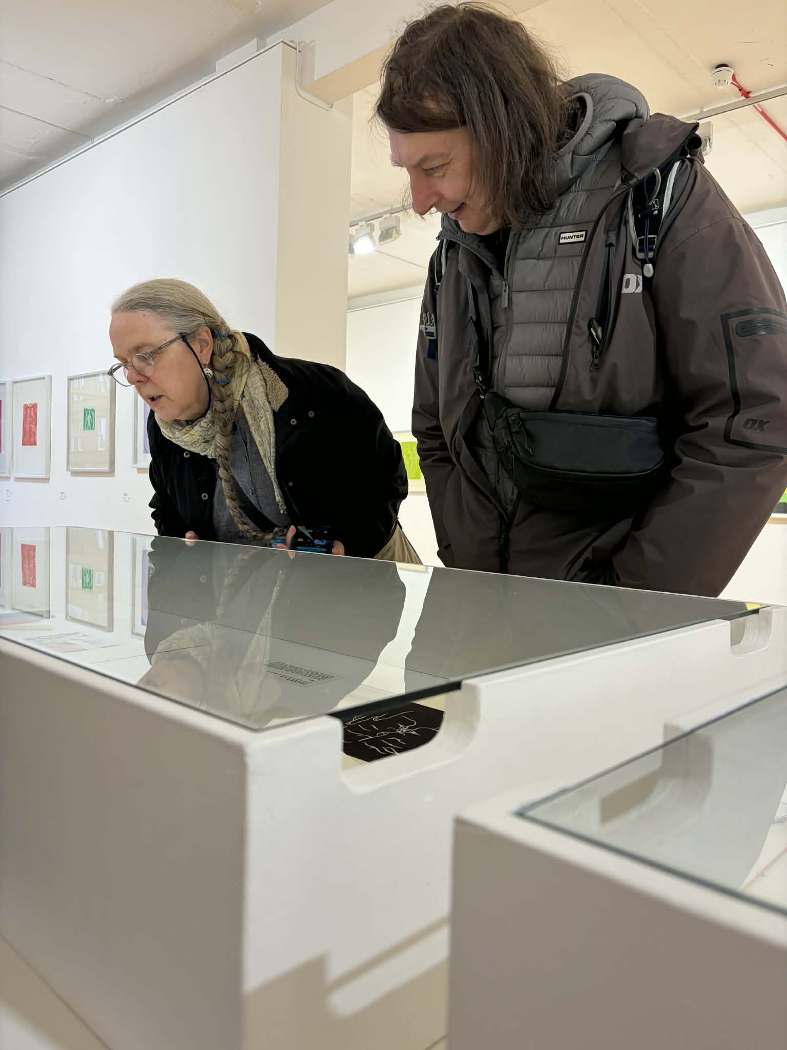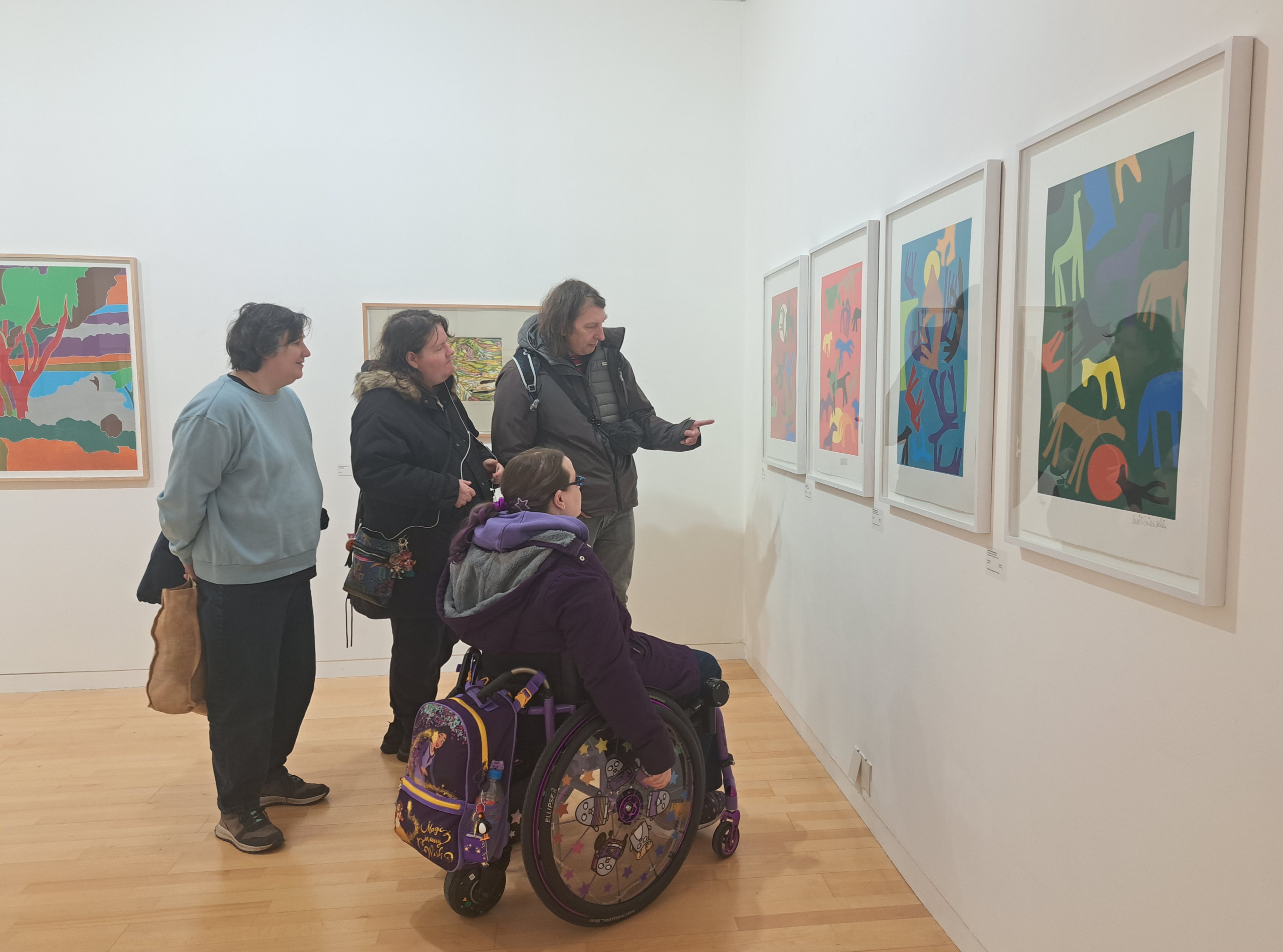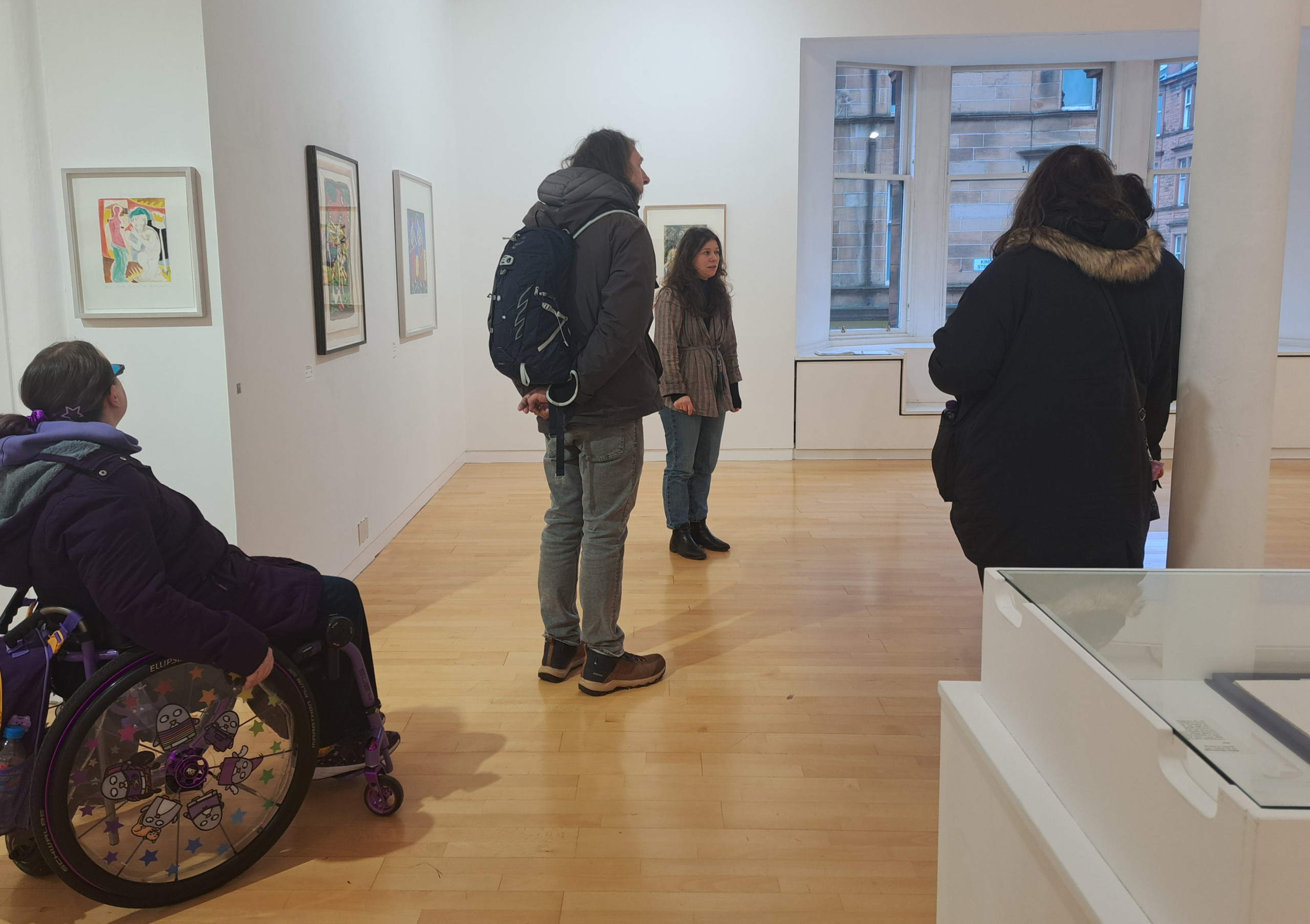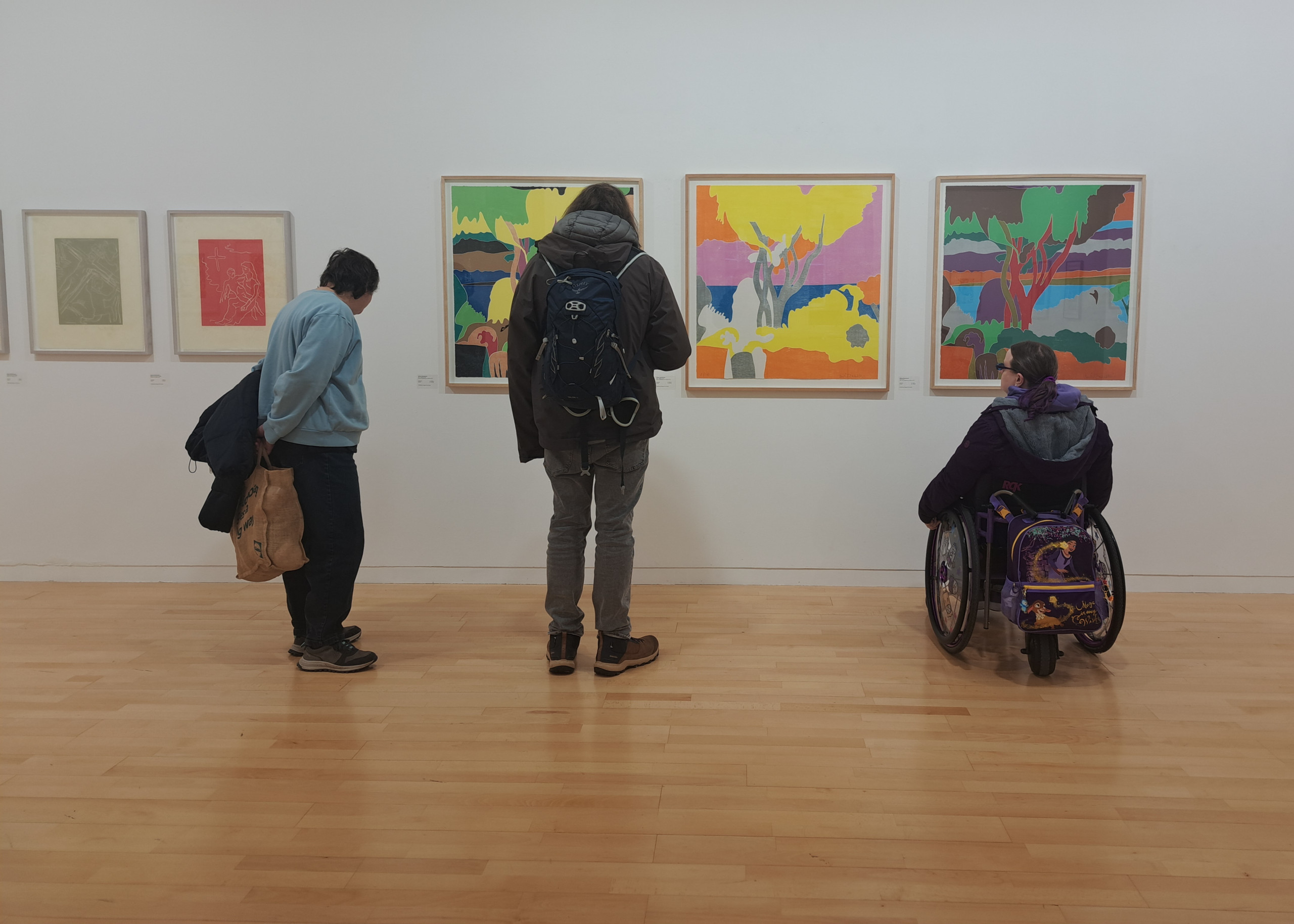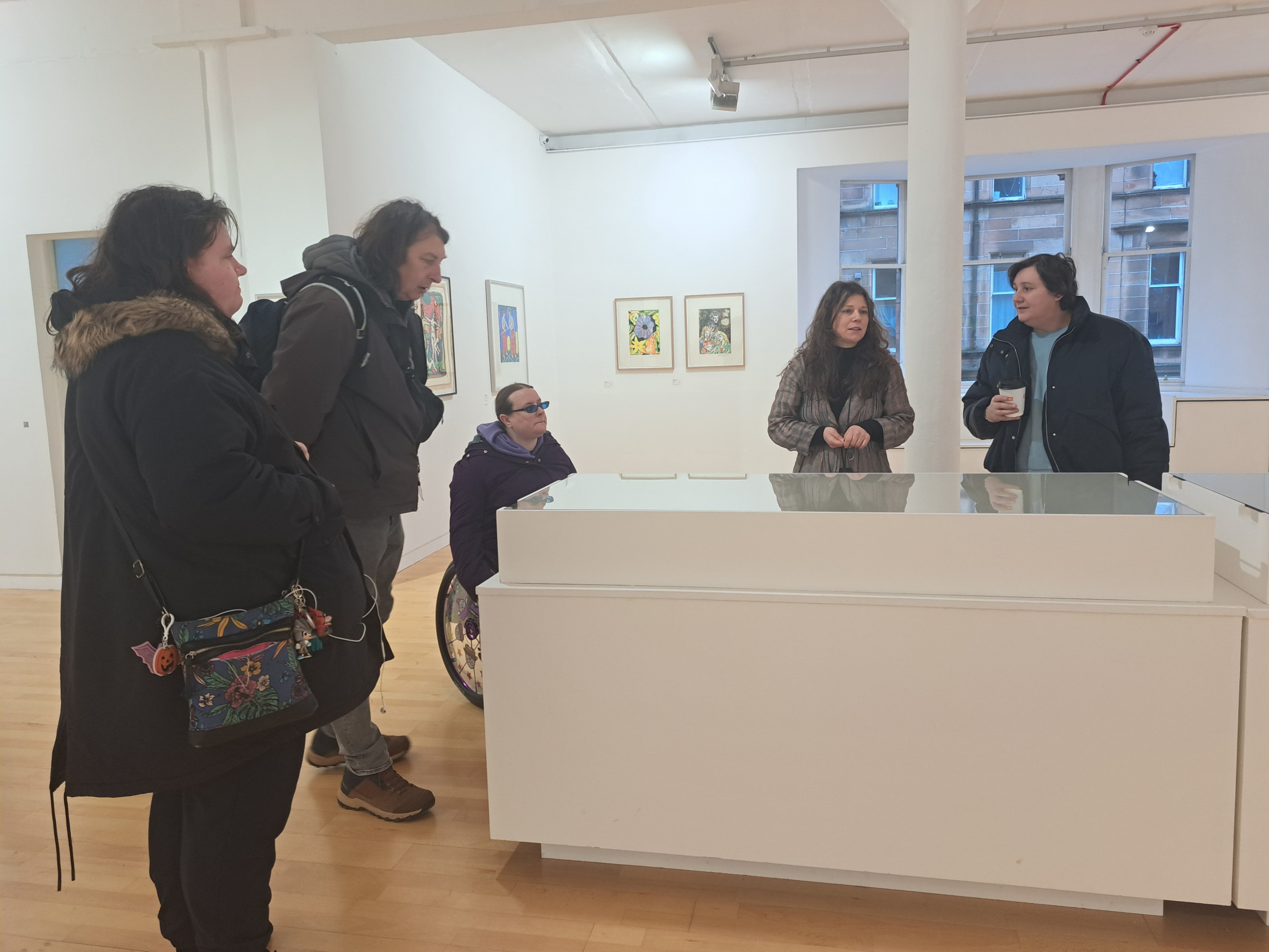 We were welcomed into the gallery by Hannah who gave us an overview of the works and we were especially taken by the laser cut woodblock prints. We were pleased to see that the artwork information was at a good height on the wall and had a chat with Hannah about the glass topped cases that were just a little bit too high for our wheeler Ruth to see the contents well.