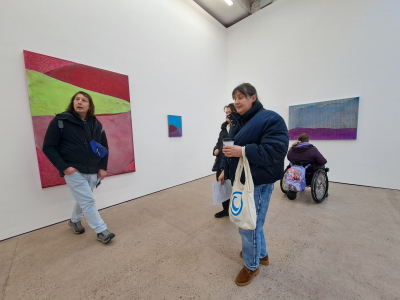 From here we went across to the Aird’s Lane gallery where we were met by Callum who introduced us to the two exhibitions there. The first of these was ‘Roots and Tourist’ by Kim Fisher, a collection of pieces composed of stretched dyed linen with resin forms mounted on top. The second exhibition is ‘Secret Smile’ by Julia Chiang, a series of paintings made by applying thin layers of paint in a variety of ways, creating colourful and captivating pieces.