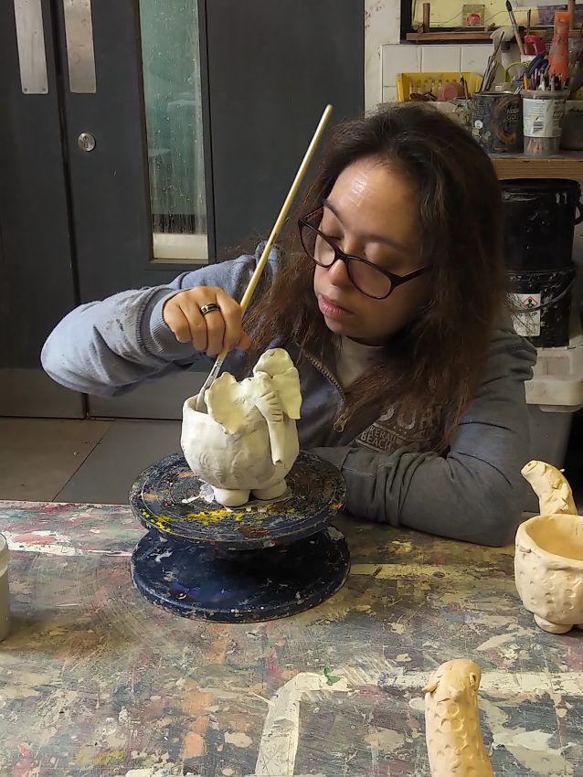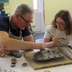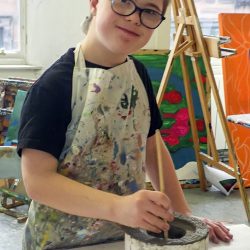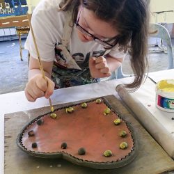 Young boy using red and white paint to paint a clay mould  two colourfully painted ceramic shapes