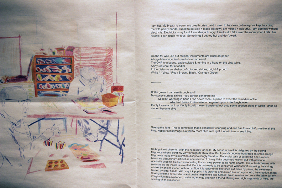The drawings are also part of a publication which saw several of our artists working with Joanna Peace and Anthony Autumn to create text to accompany the drawings in a printed publication. This publication is for sale in our gallery shop and online. The writing workshops, led by Joanna and Anthony, provided an opportunity for the artists at Project Ability to share their thoughts about the studios and the creative environment they help to create here.
